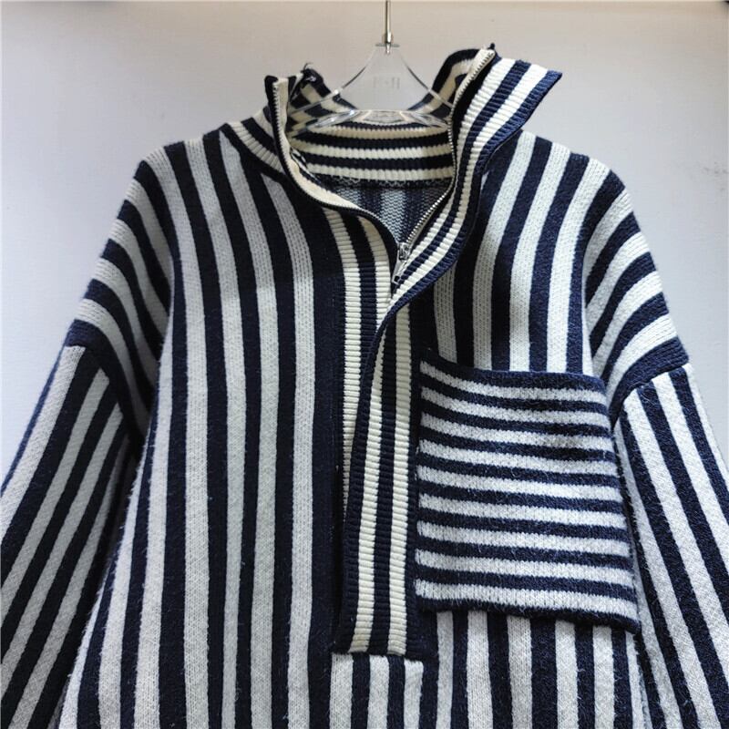 [EWQ] ブルーホワイトストライプセーター長袖ハーフオープンジッパーネックプルオーバーニットトップ秋冬 16U4763 ロング オータム 秋物 ウィンター 冬物