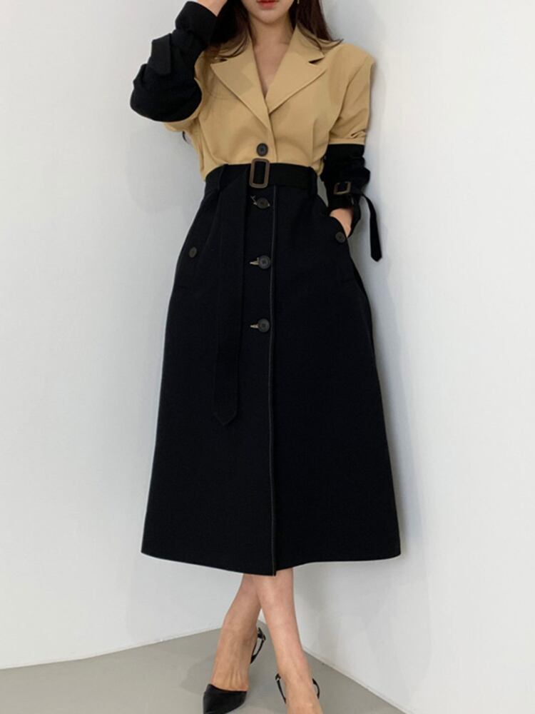 [EWQ] パッチワークコントラスト ベルト付き ウインドブレーカー 秋冬 長袖 包帯バックル トレンチジャケット 16U3826 ロング オータム 秋物 ウィンター 冬物 ハーネス