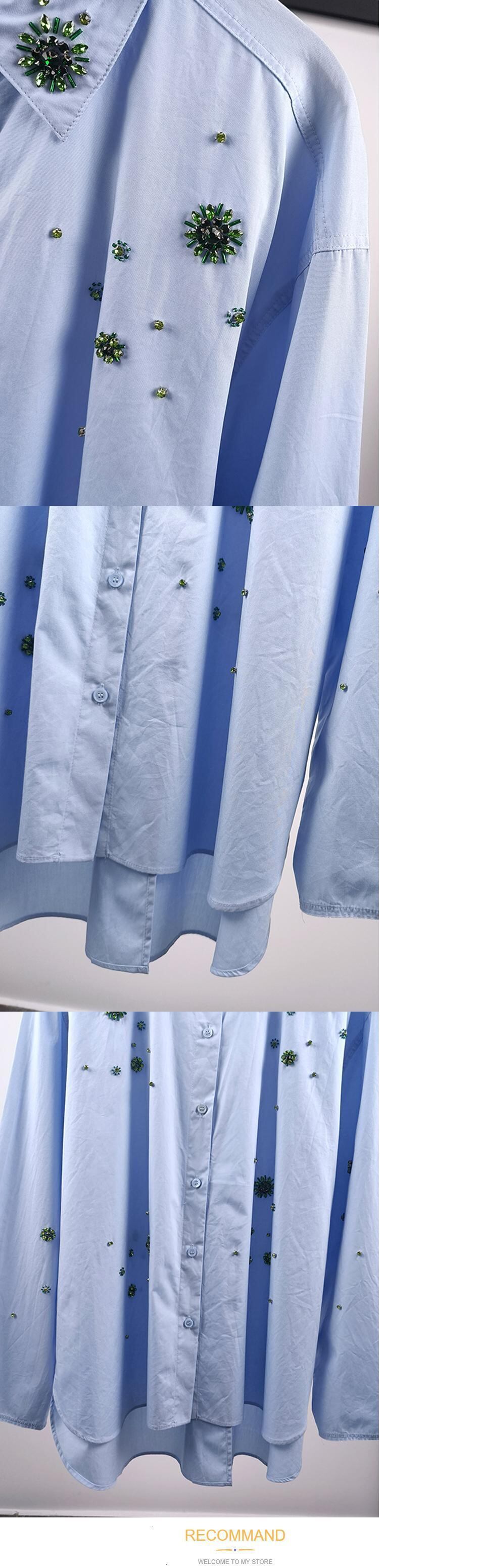 [EWQ] 長袖ビーズシャツ美しいオフィスブラウス秋不規則ビッグ Zise トップスルーズブルー ロング オータム 秋物 会社 学校 通勤や通学にも