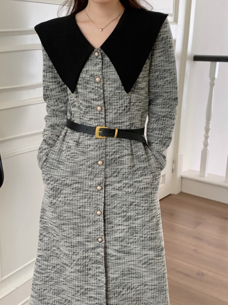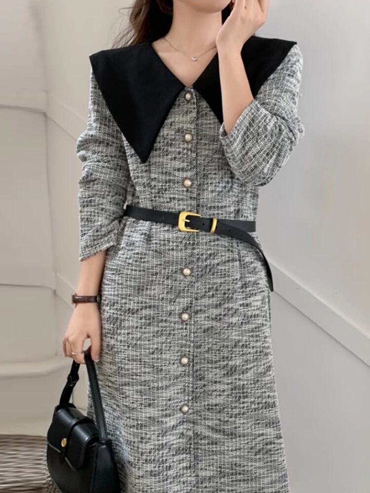 [EWQ] 弾性ベルトドレスコントラストラペルパッチワークシングルブレストドレス秋冬潮 16U4244 エラスティック 伸縮 オータム 秋物 ウィンター 冬物 ハーネス