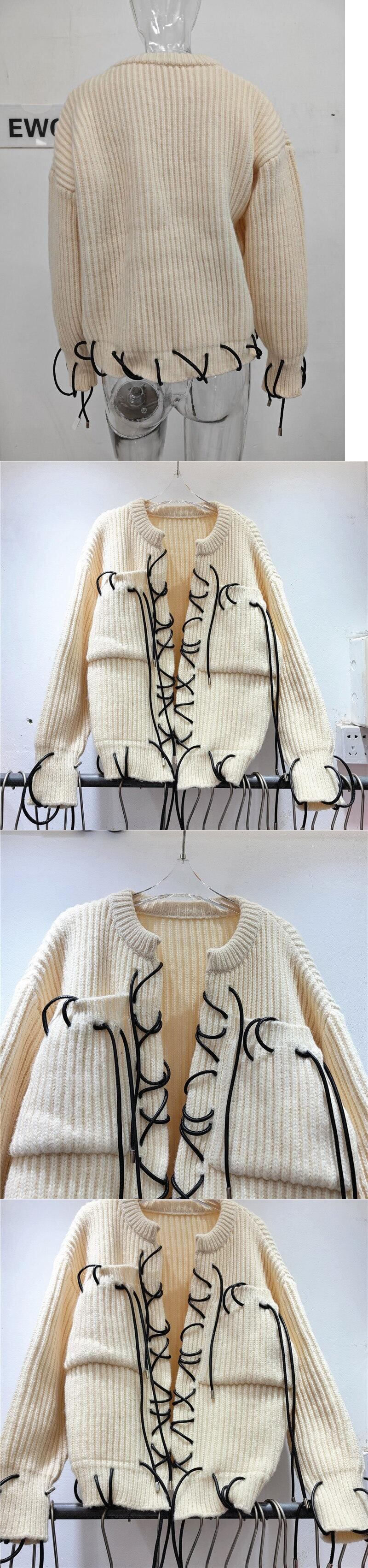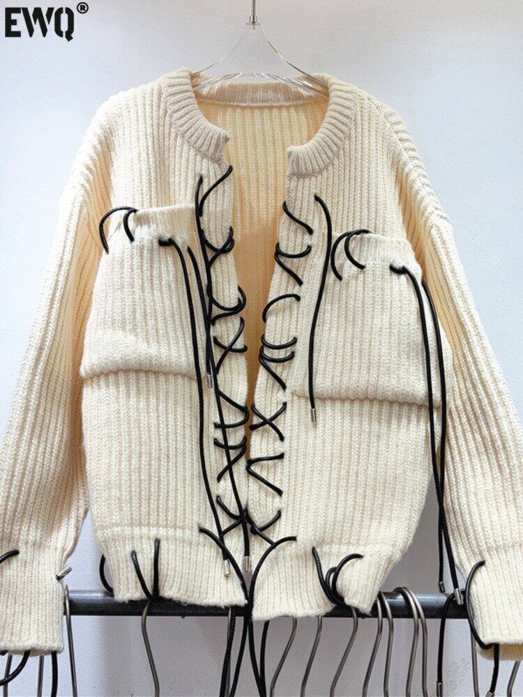 [EWQ] 織巾着バックルカーディガンコート長袖ルーズセータージャケット秋冬 16U4404 ロング オータム 秋物 ウィンター 冬物