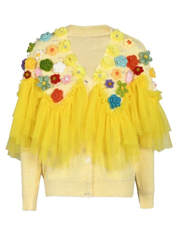 [EWQ] 甘い 3D カラフル花カーディガンコートメッシュパッチワークルーズ長袖セータージャケット秋冬 16O489 ロング 大人ガーリー スウィート キュート カジュアル オータム 秋物 ウィンター 冬物 フラワーデザイン