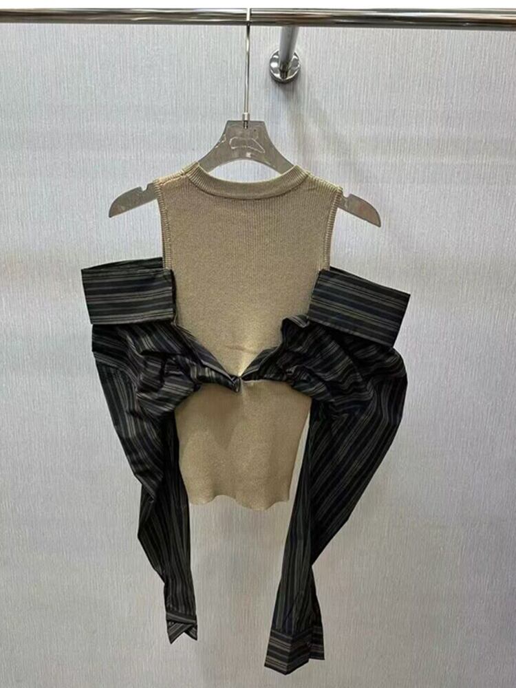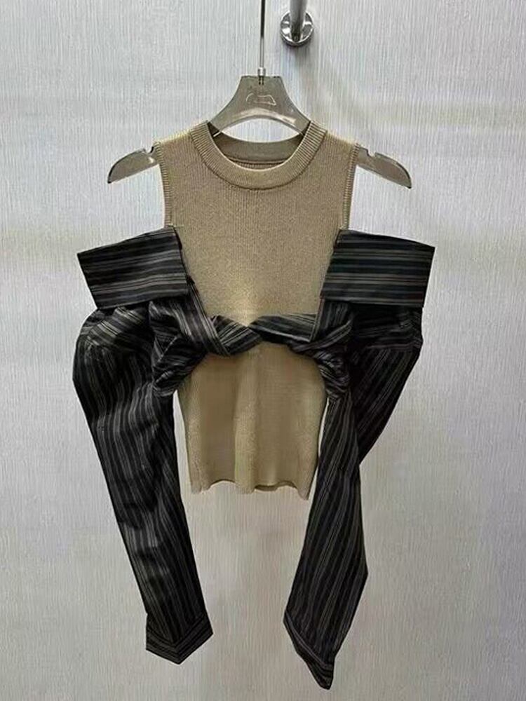 [EWQ] ニット スプライス シャツ 長袖 ストライプ オフショルダー レディース フェイク 2 ピース トップス 秋冬 16U4473 ロング オータム 秋物 ウィンター 冬物