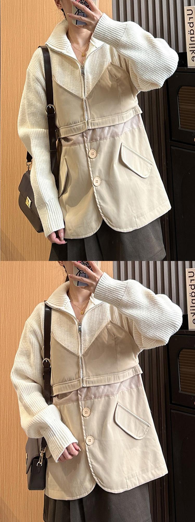 [EWQ] 長袖パッチワークフェイクツーピースセーターカーディガンコートジッパージャケット秋 16O484 ロング オータム 秋物