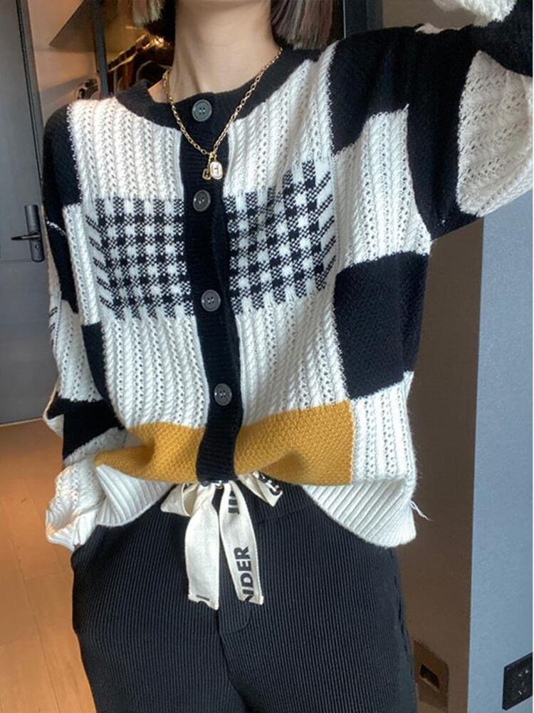 [EWQ] エイブルチェック柄コントラストニットカーディガンコート中空アウトセータージャケット秋冬 16U4725 オータム 秋物 ウィンター 冬物