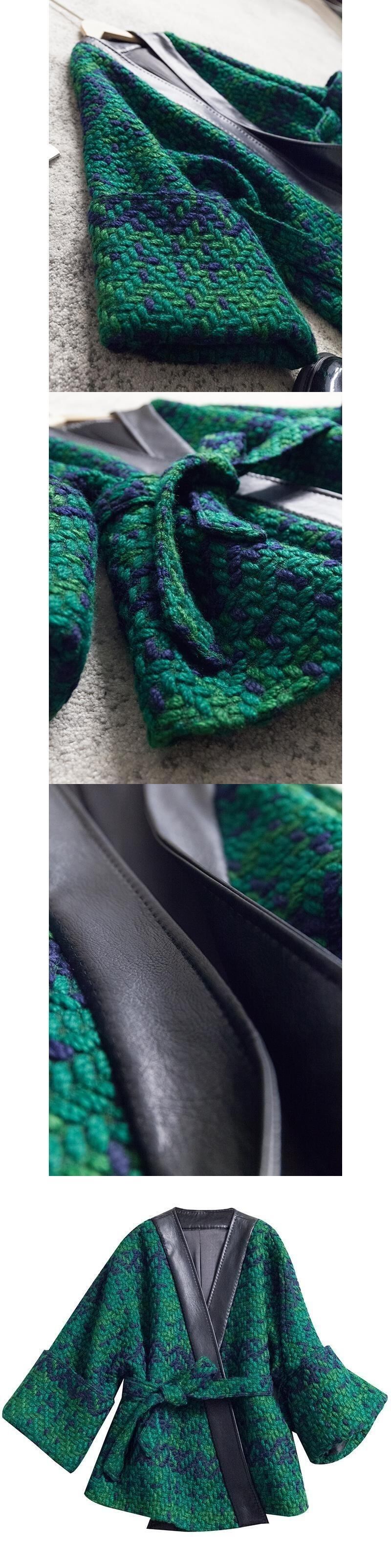 [EWQ] ニットパッチワークトップツイードジャケット冬スプリングコート長袖 Pu レザー V ネックグリーンアウター 16Y3430 ロング 春物 ウィンター 冬物 Vネック
