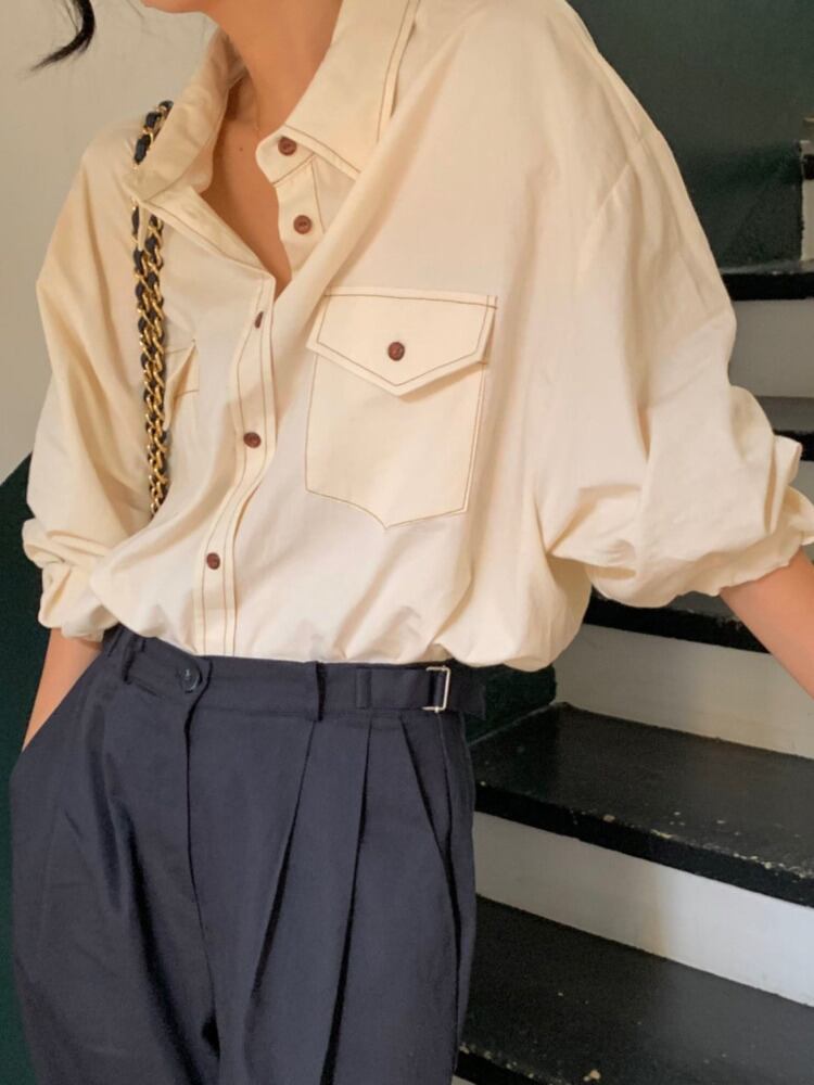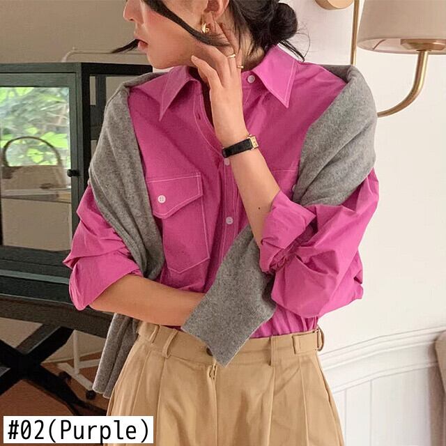 [EWQ] レディース シャツ ブライトライン装飾 ダブルポケット パッチワーク ゆったり 秋冬 U4227 オータム 秋物 ウィンター 冬物