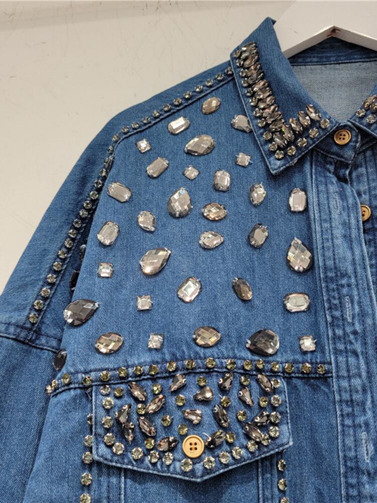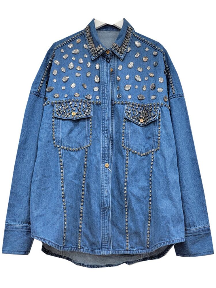[EWQ] リベット装飾ビーズデニムシャツジャケットトレンドシングルブレストルーズブルージャケット秋冬 16U4704 オータム 秋物 ウィンター 冬物