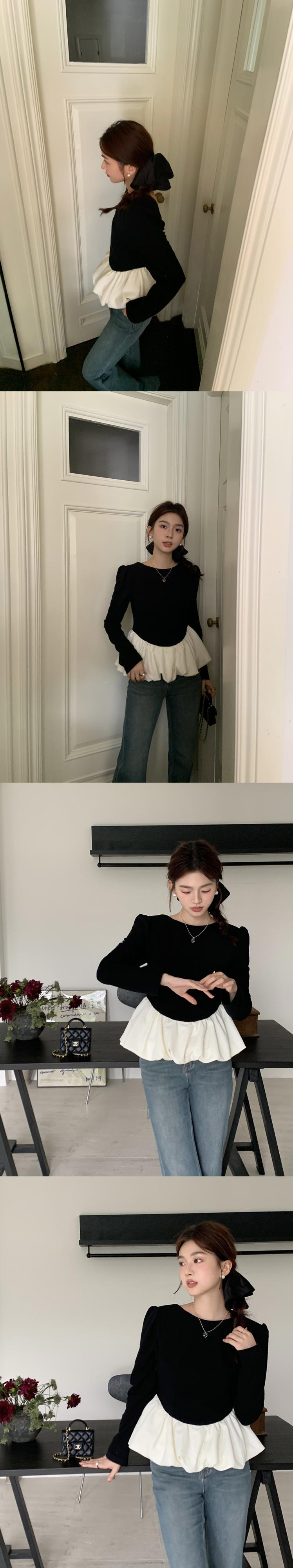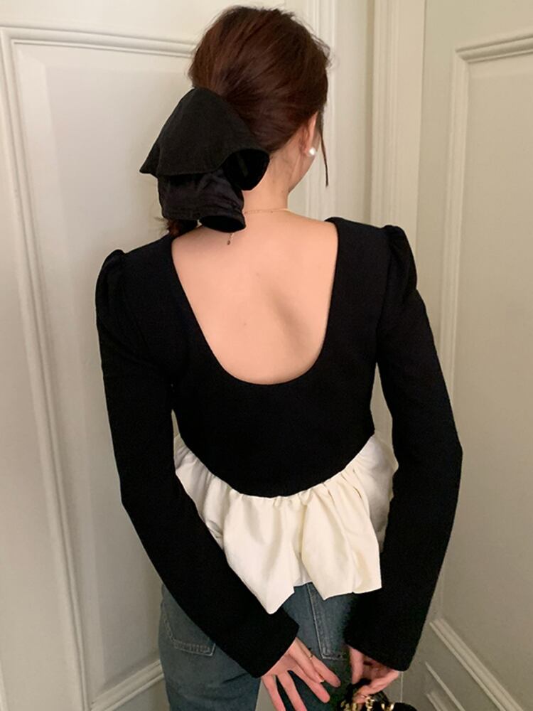 [EWQ] セクシー背中開いたシャツ長袖フリルパッチワークコントラストスリム秋冬トップ 16U4455 ロング オータム 秋物 ウィンター 冬物