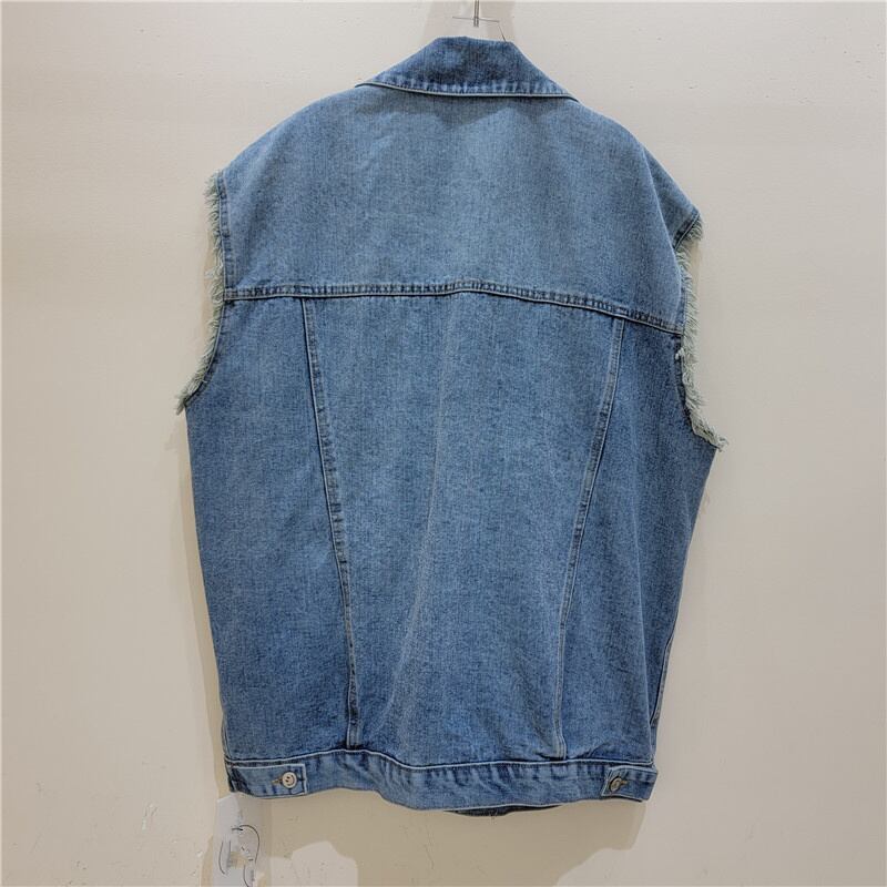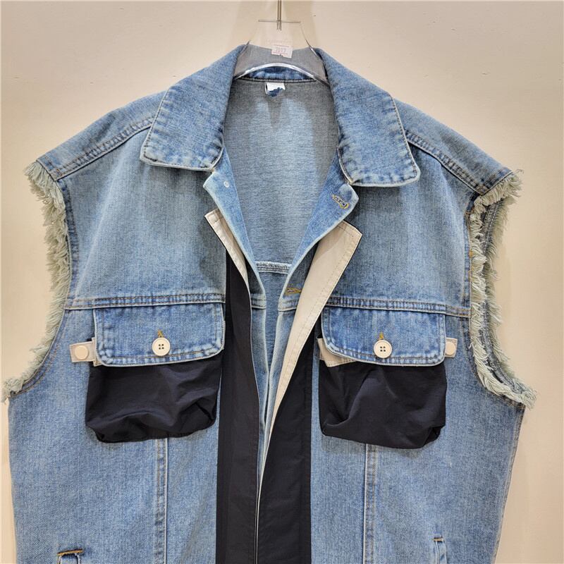 [EWQ] 3D ポケットパッチワークデニムベストシングルブレストストリートコントラストノースリーブジャケット秋潮チョッキ オータム 秋物