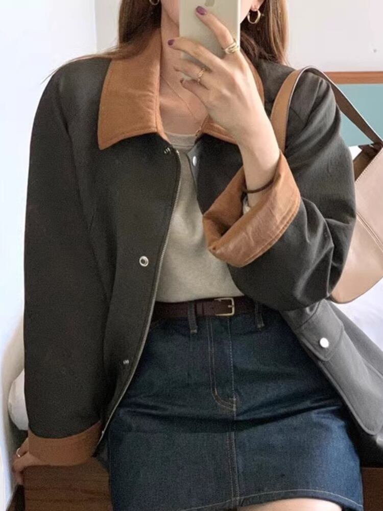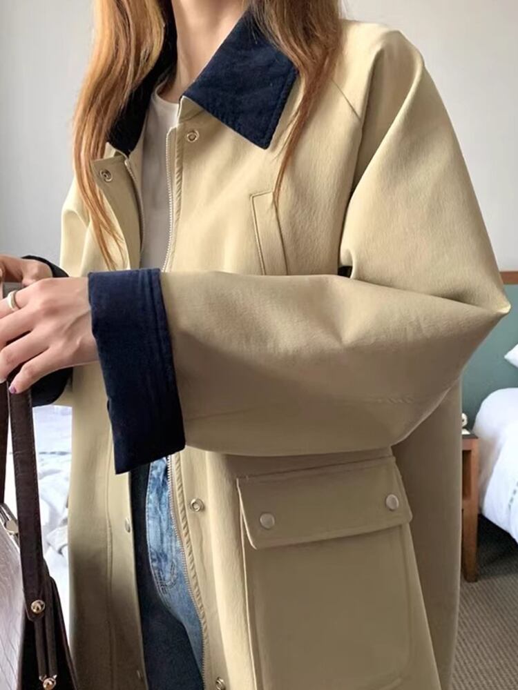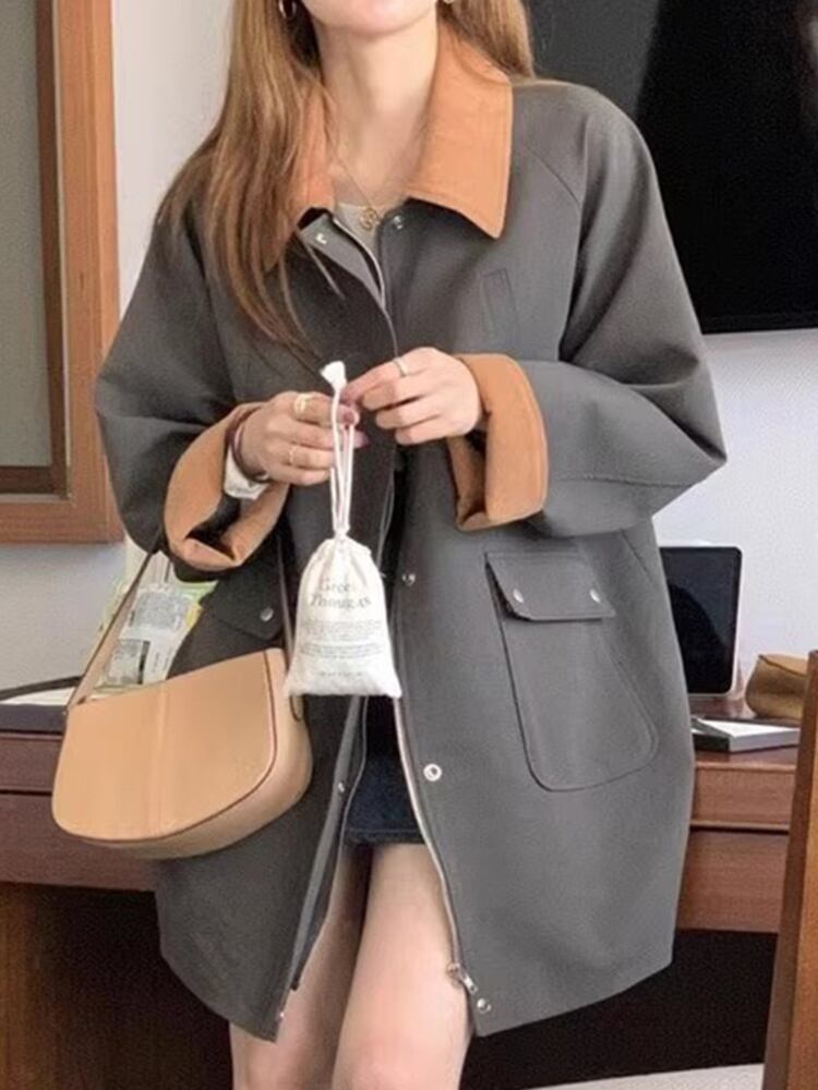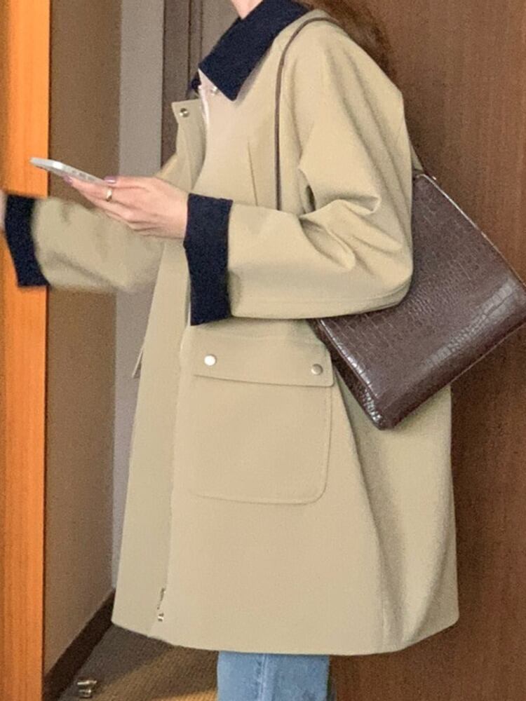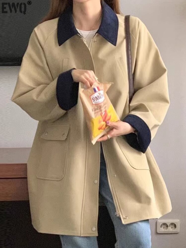 [EWQ] ラペルコントラストパッチワークルーズウインドブレーカージャケットポケットシングルブレストトレンチコート秋冬 16U4082 オータム 秋物 ウィンター 冬物