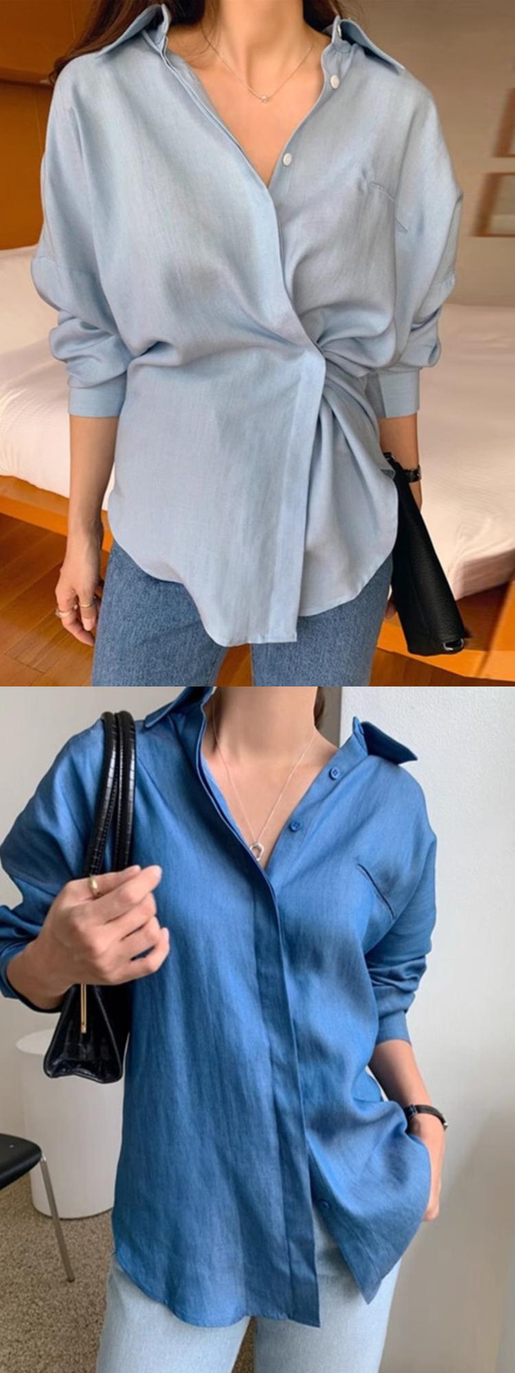 [EWQ] ネイビー ブルー イレギュラー バックル シャツ レディース 長袖 ゆったり 秋潮 トップス 16U3580 ロング オータム 秋物