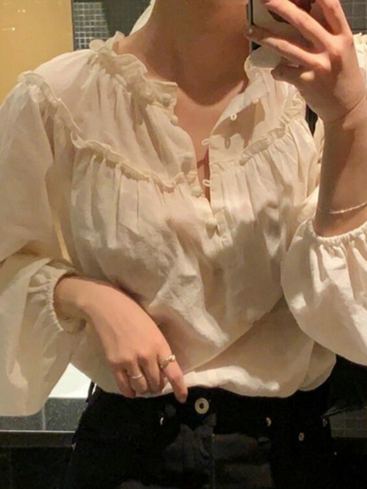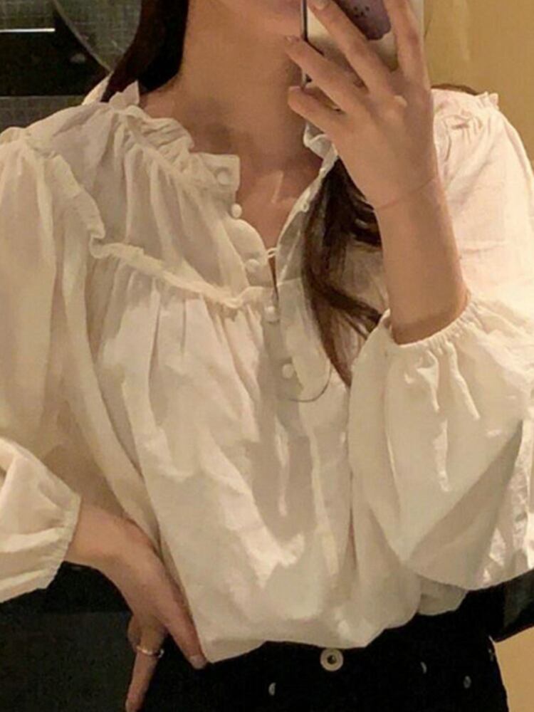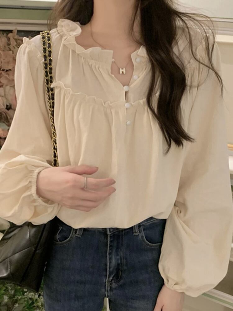 [EWQ] O ネック菌パッチワークアプリコットシャツ長袖シングルブレストルーズ秋潮トップ ロング オータム 秋物 Oネック