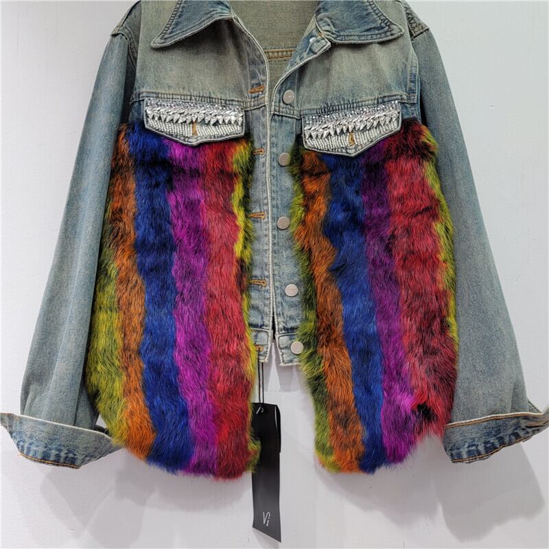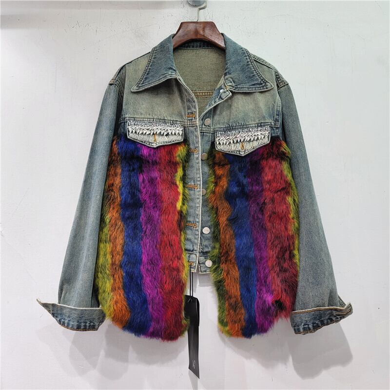 [EWQ] 高級デニムジャケット ダイヤ継ぎカラフルラビットヘアコート ストリート 秋冬 16U4671 オータム 秋物 ウィンター 冬物