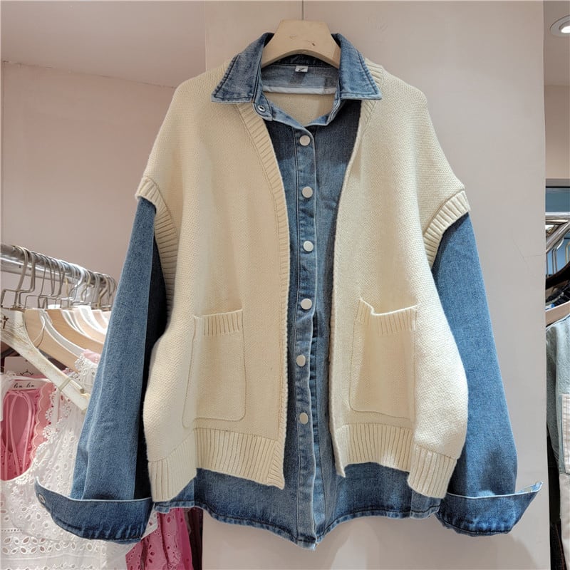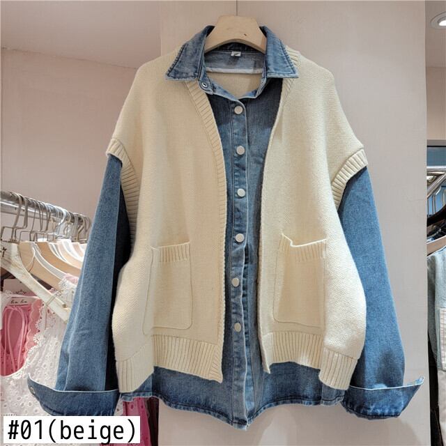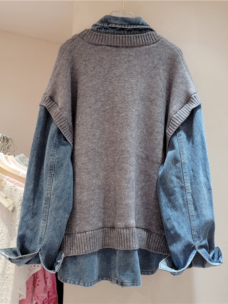[EWQ] 長袖セーター パッチワーク デニムジャケット ストリート 大きいサイズ シングルブレスト ジャケット コート 秋冬 ロング オータム 秋物 ウィンター 冬物
