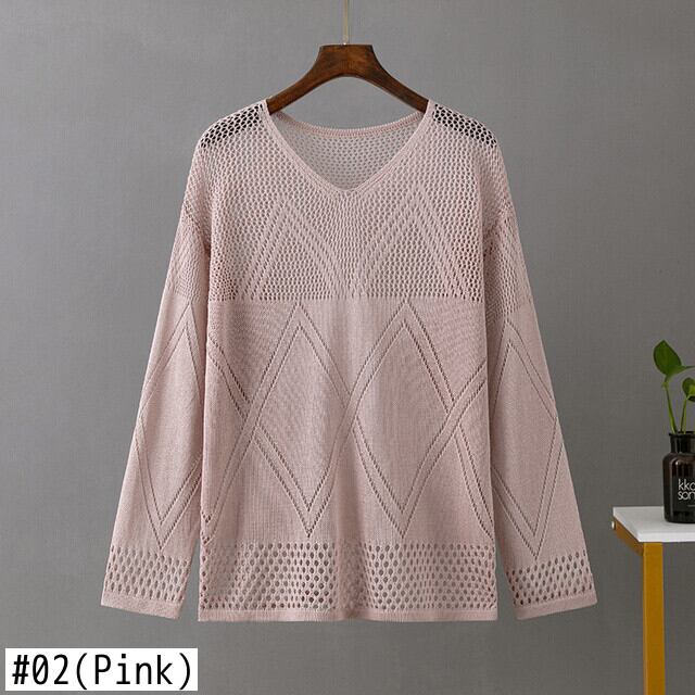 [EWQ] 秋中空アウト幾何学ニットシャツ長袖 V ネック弾性ルーズトップトレンド ロング エラスティック 伸縮 オータム 秋物 Vネック