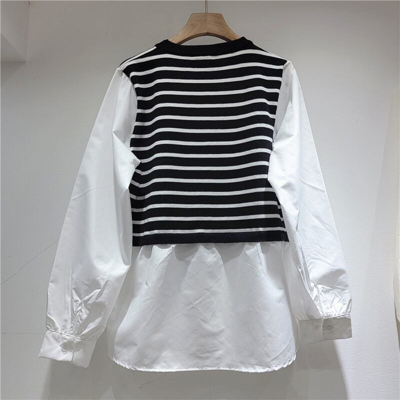 [EWQ] 偽ツーピースパッチワークストライプシャツ長袖ルーズ秋潮オールマッチ服 ロング オータム 秋物