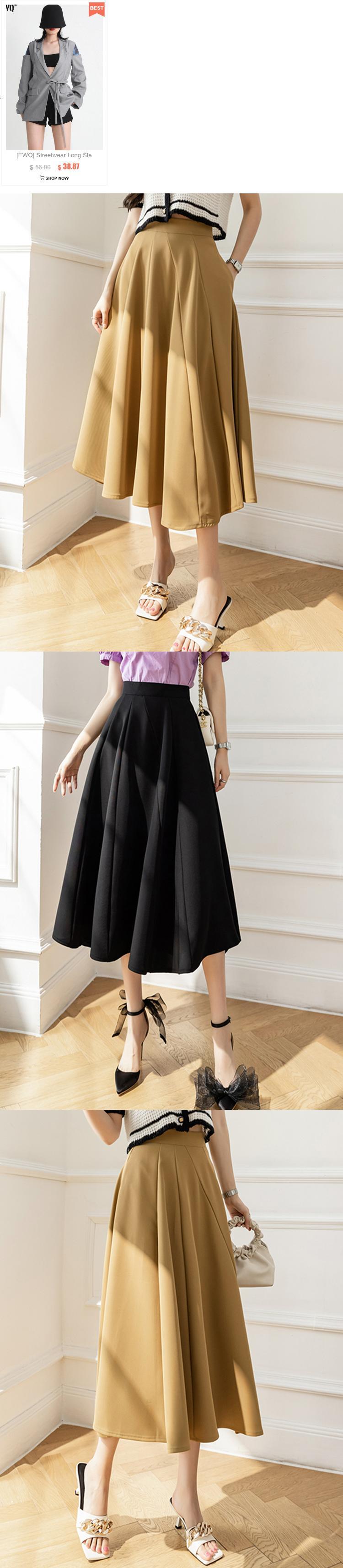 [EWQ] ウエスト プリーツ ポケット スカート レディース ソリッド カラー ルーズ 秋 ファルダス A ライン スカート 3464 オータム 秋物 Aライン ソリッドカラー
