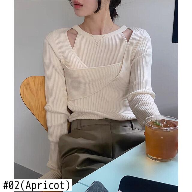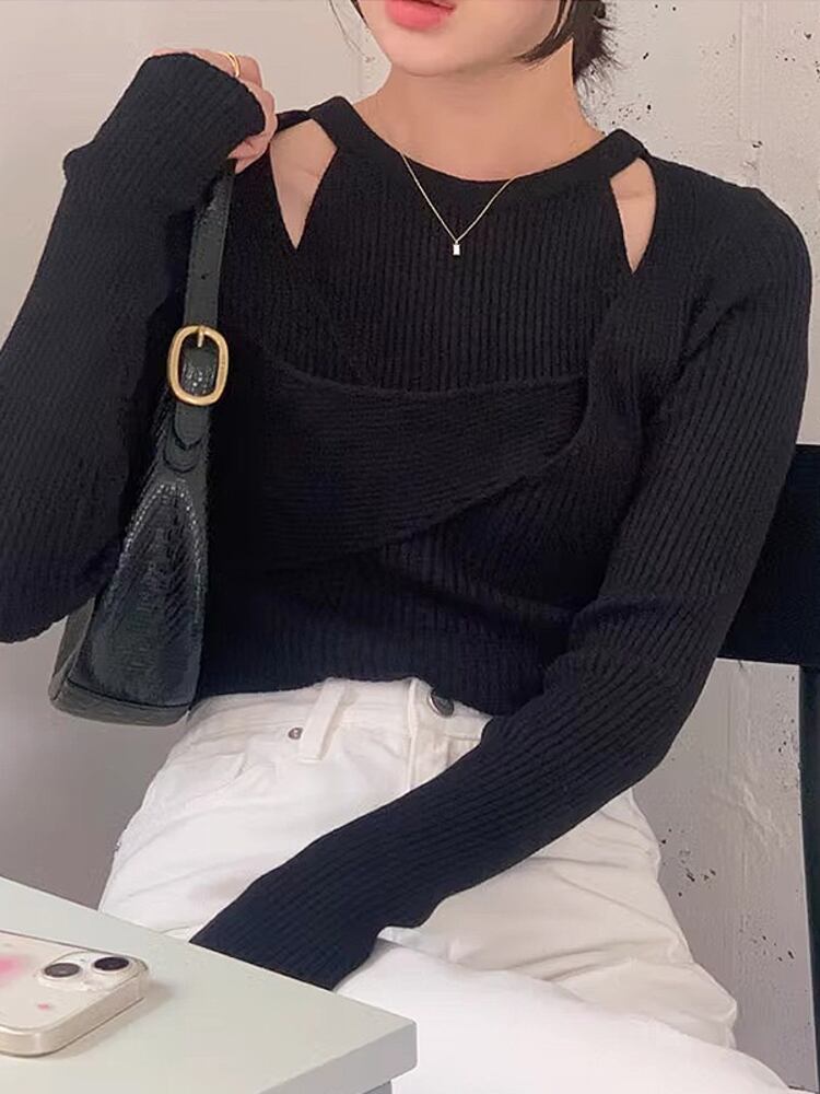 [EWQ] 不規則スプライス中空アウト O ネックセーター長袖プルオーバーニットトップ秋冬 16U4574 ロング オータム 秋物 ウィンター 冬物 Oネック