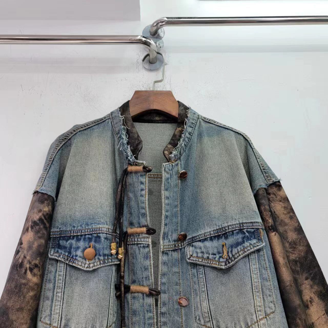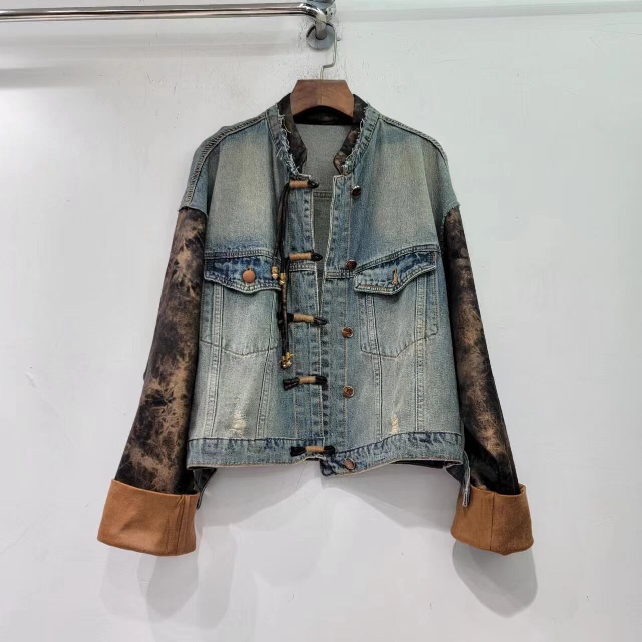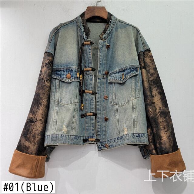 [EWQ] プリントスプライス長袖デニムジャケットシックボタンルーズコートストリート秋冬 16U4291 ロング オータム 秋物 ウィンター 冬物