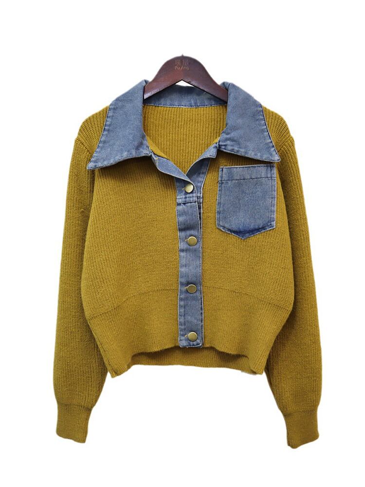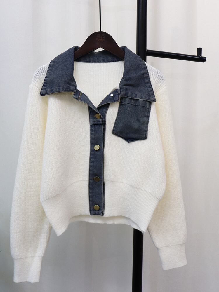 [EWQ] デニムパッチワークショートカーディガンコートシングルブレスト弾性セータージャケット秋冬 6U3900 エラスティック 伸縮 オータム 秋物 ウィンター 冬物