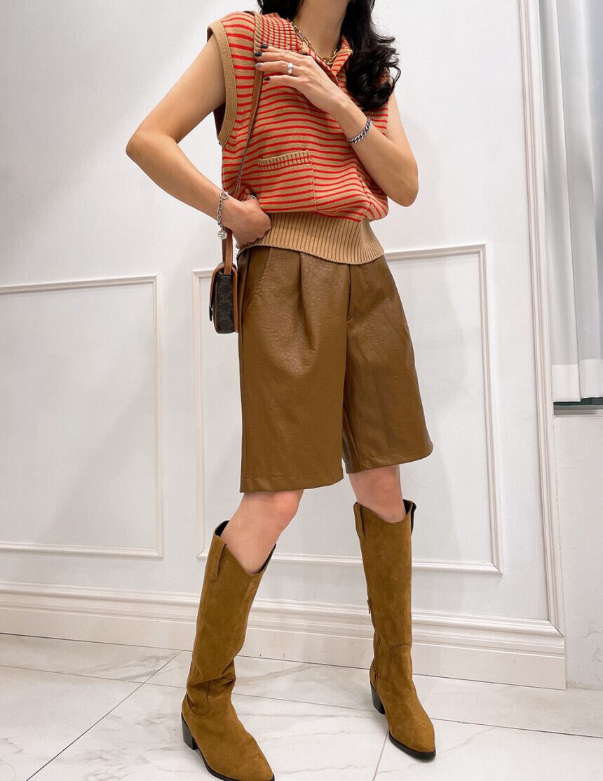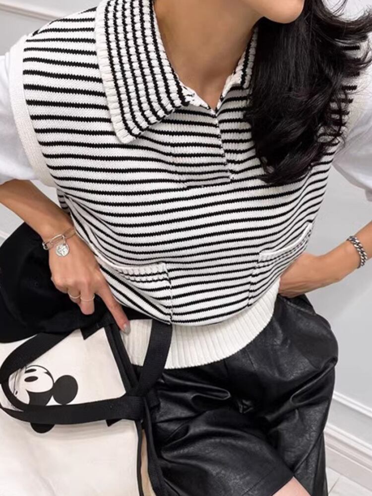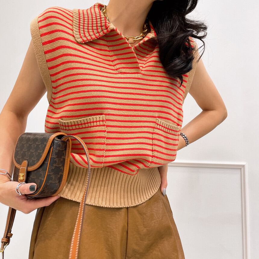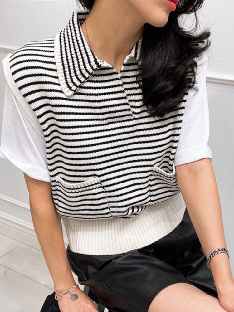 [EWQ] ストライプポケットスプライシングコントラストセーターベストノースリーブラペルプルオーバータンク秋冬 16U4573 オータム 秋物 ウィンター 冬物