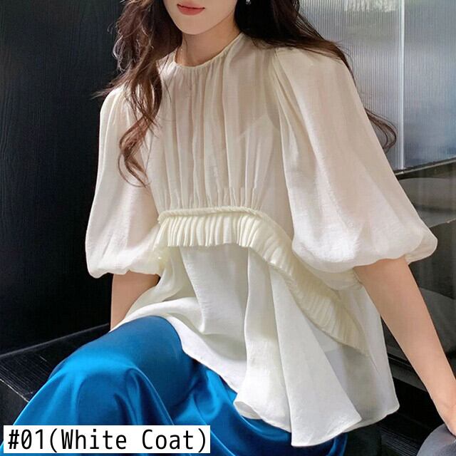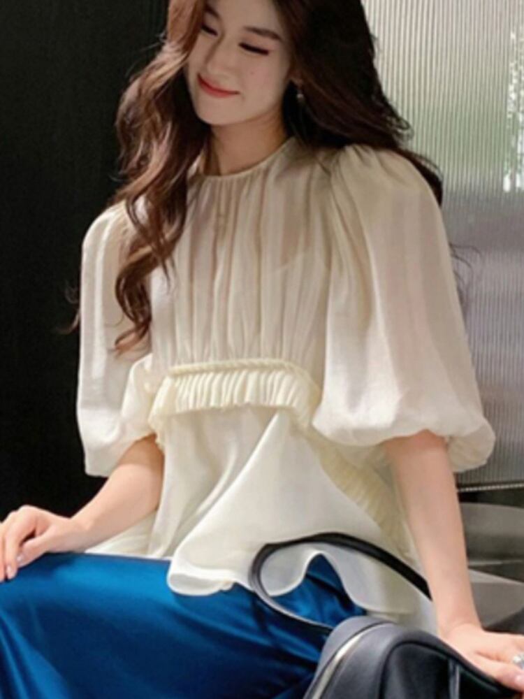 [EWQ] ホワイトファンガスパッチワークシャツランタンスリーブルーズプリーツサマータイドブラウストップ 16U2203 夏物