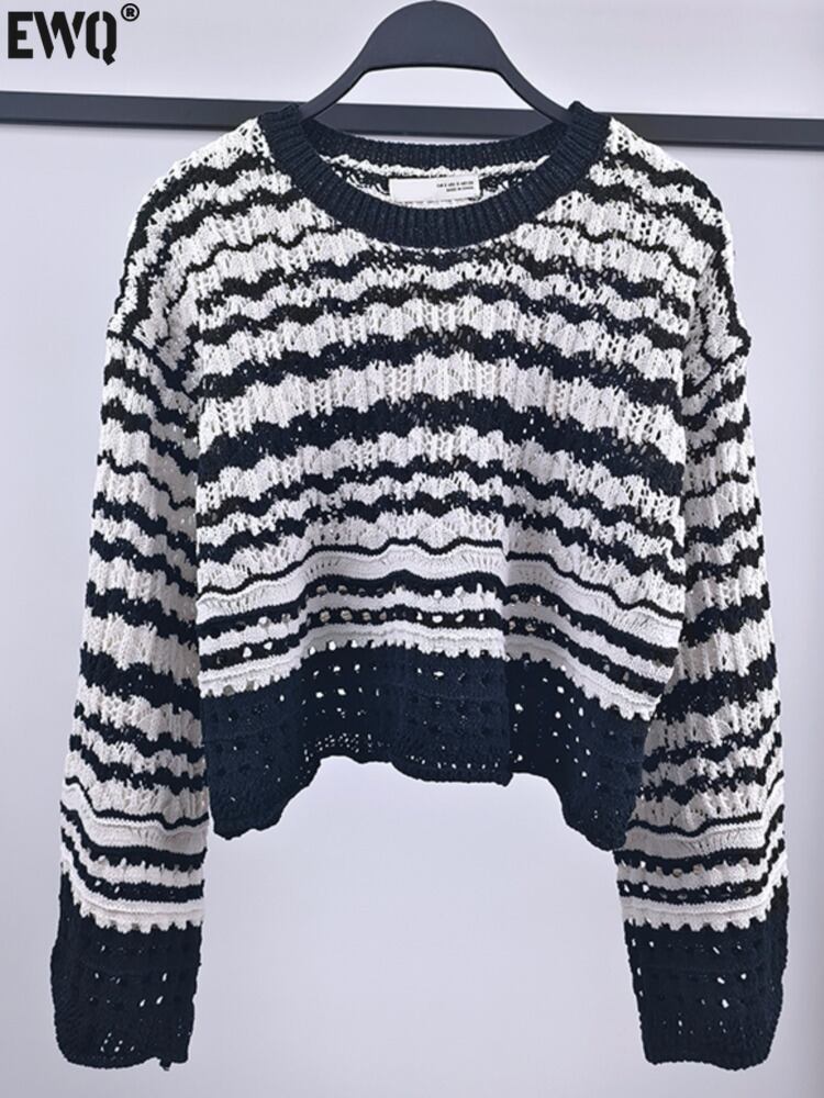 [EWQ] 黒白ストライプコントラストセーター中空アウト O ネックルーズプルオーバーニットトップ秋冬 16U4728 ホワイト ブラック オータム 秋物 ウィンター 冬物 Oネック