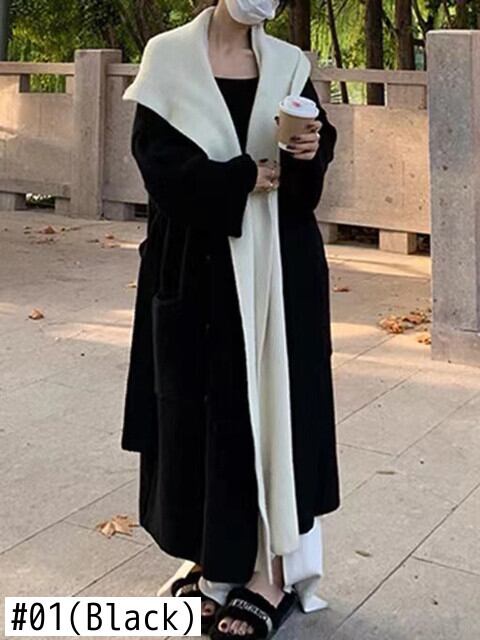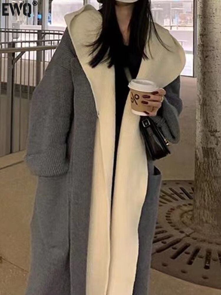 [EWQ] フェイクツーピースフード付きカーディガンコートパッチワークコントラストゆったり丈セータージャケット厚手秋冬 16U4352 オータム 秋物 ウィンター 冬物