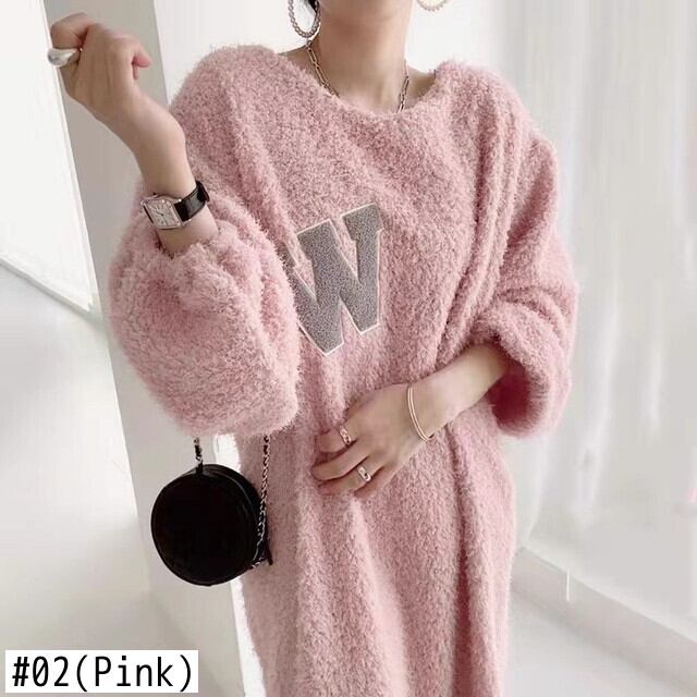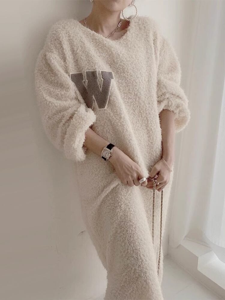 [EWQ] ラムウールドレス冬長袖レターパッチワークルーズドレス Vestido 秋冬 16U4954 ロング オータム 秋物 ウィンター 冬物