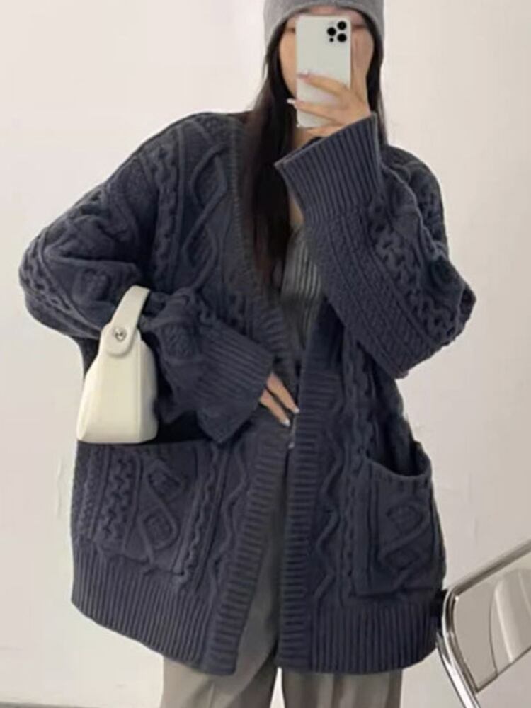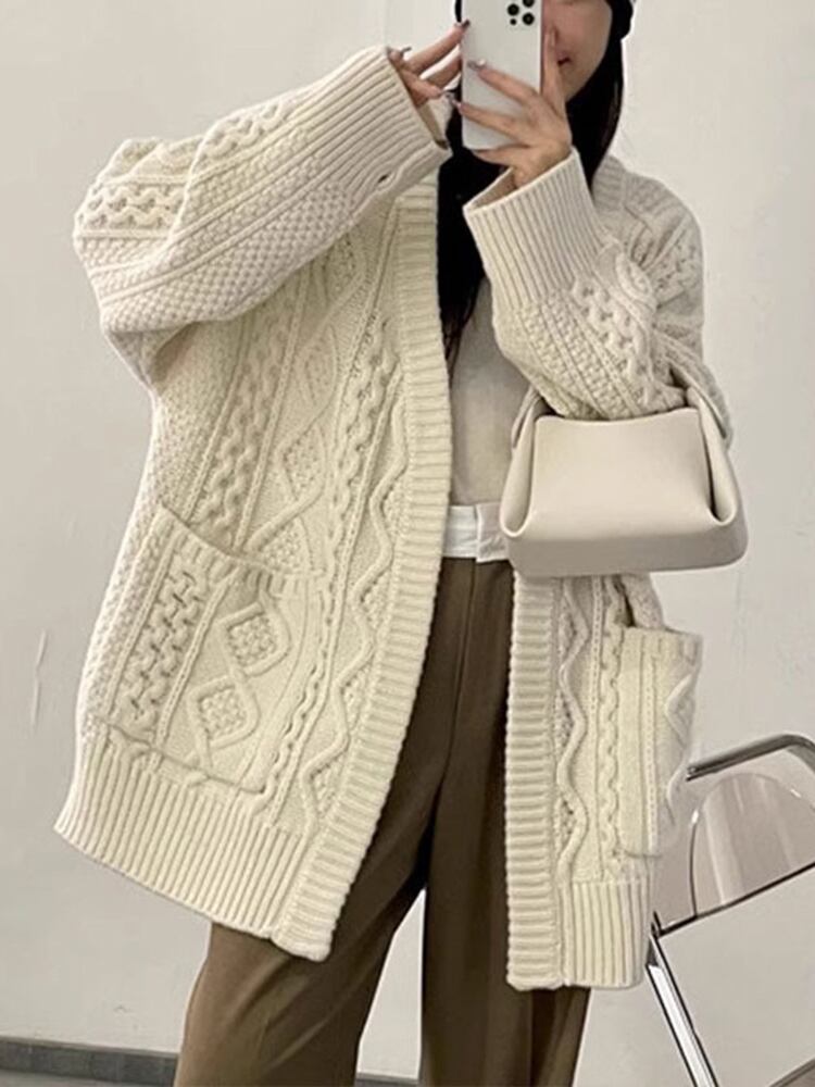 [EWQ] ミニマリスト厚手カーディガンコートダブルポケットパッチワークベージュルーズセータージャケット秋冬 16U3996 オータム 秋物 ウィンター 冬物