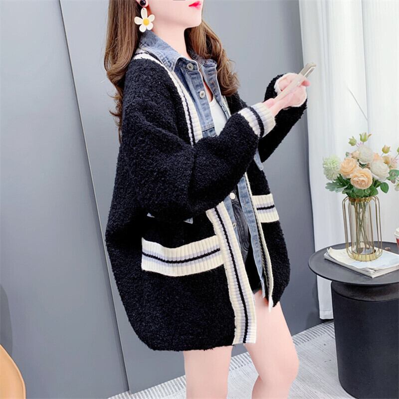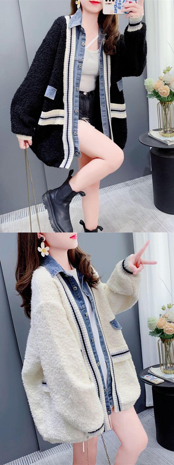 [EWQ] デニムスプライスコントラストカーディガンコートポケットパッチワークルーズセータージャケット秋冬 16U4016 オータム 秋物 ウィンター 冬物