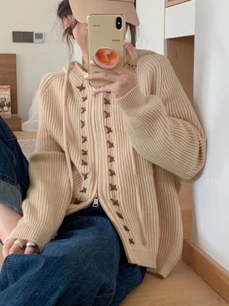 [EWQ] コントラスト刺繍カーディガンコート長袖フード付きジッパーセータージャケット秋冬 16U4005 ロング オータム 秋物 ウィンター 冬物