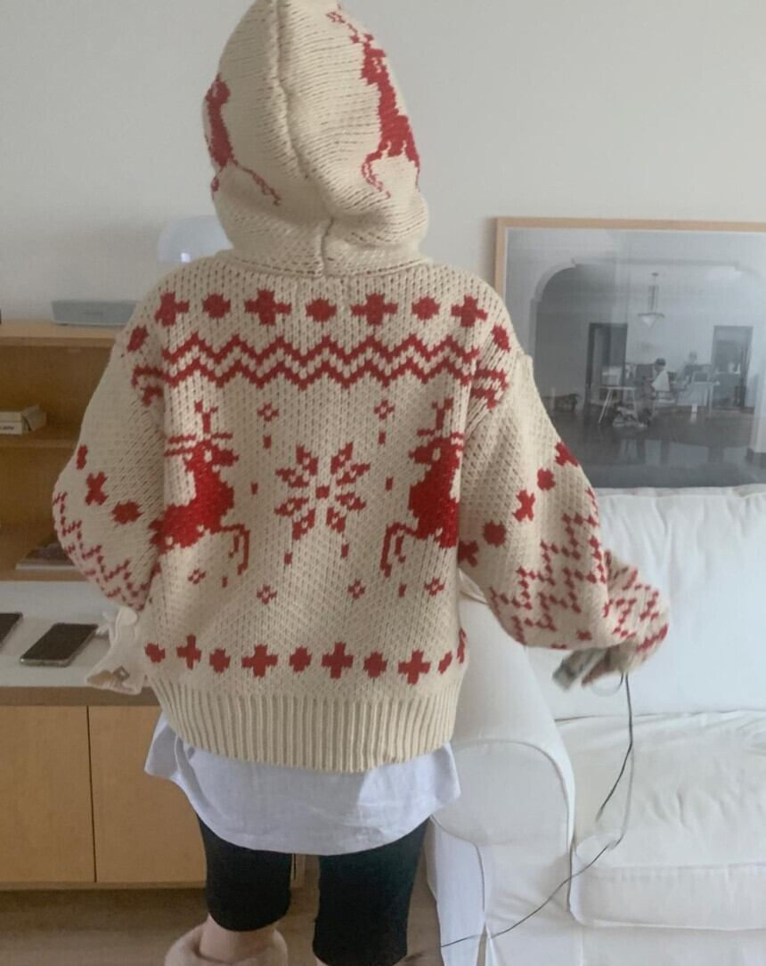 [EWQ] レッドジャカードカーディガンコートフード付きジッパー長袖セータージャケット秋冬トップ 16U5026 ロング オータム 秋物 ウィンター 冬物