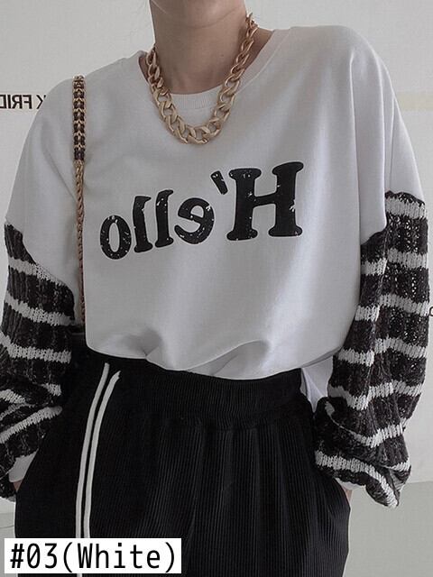[EWQ] ストライプ ニット パッチワーク 長袖スウェット レディース レター コントラスト プルオーバー 秋冬 16U4718 ロング シャツ オータム 秋物 ウィンター 冬物