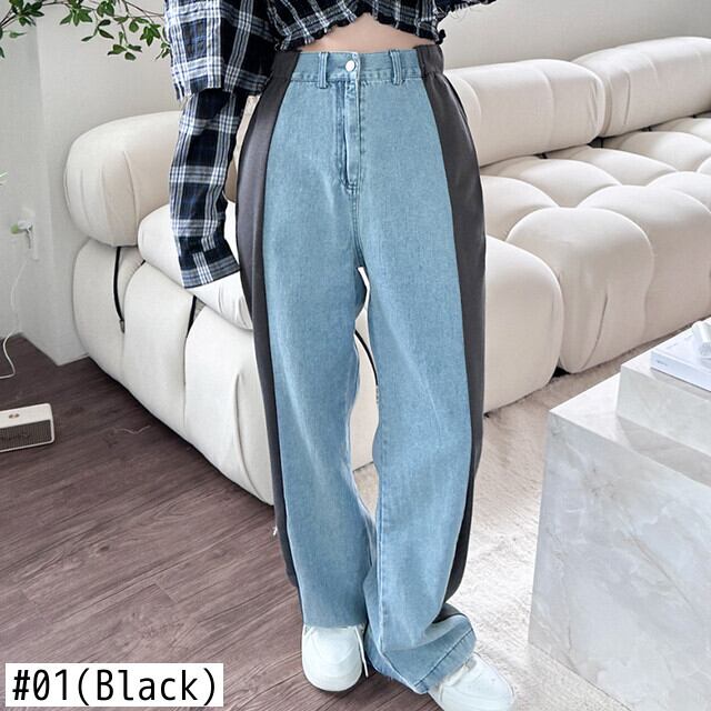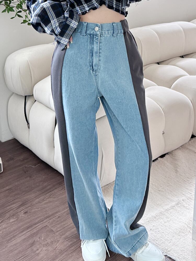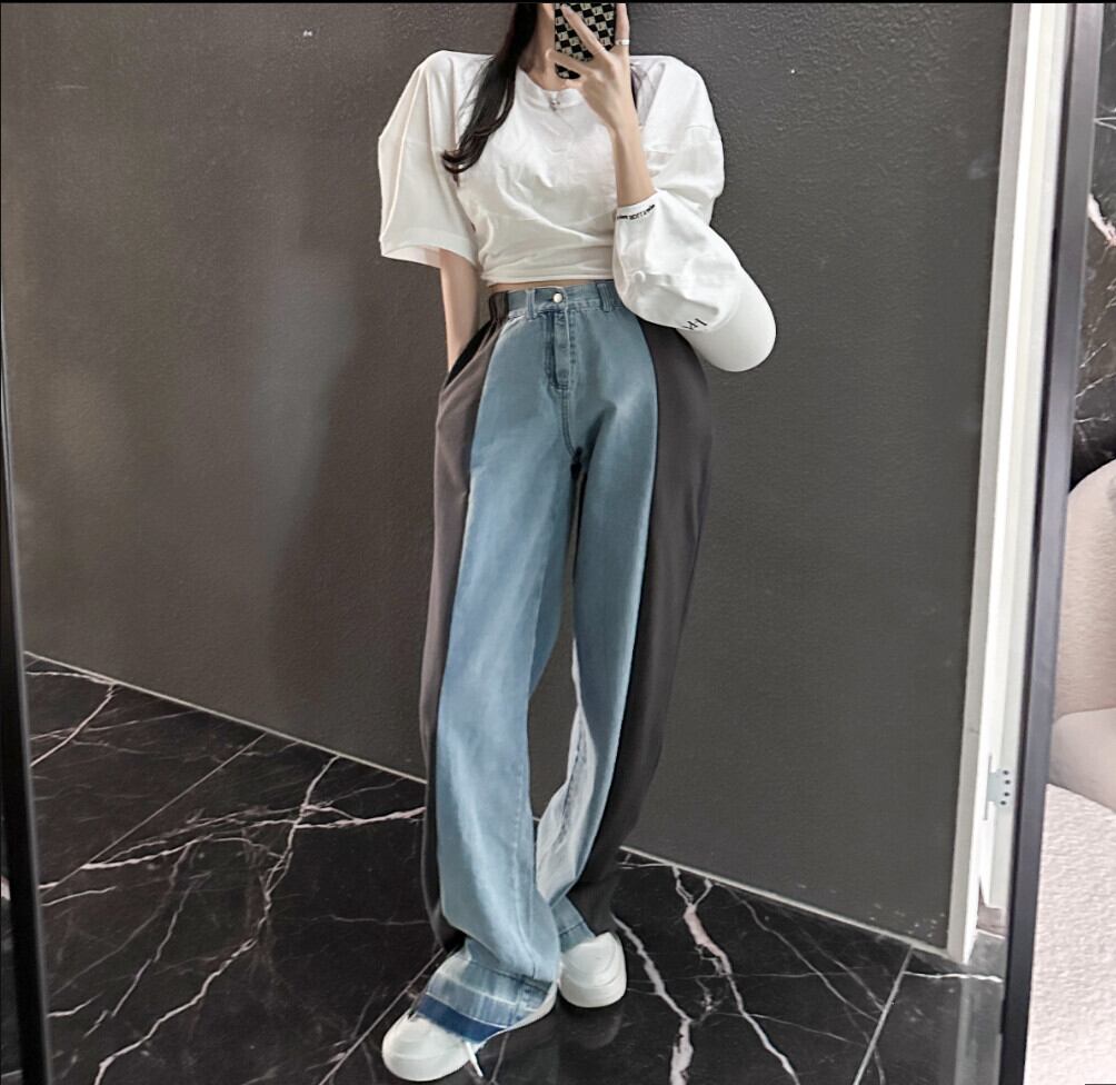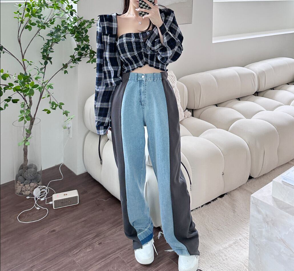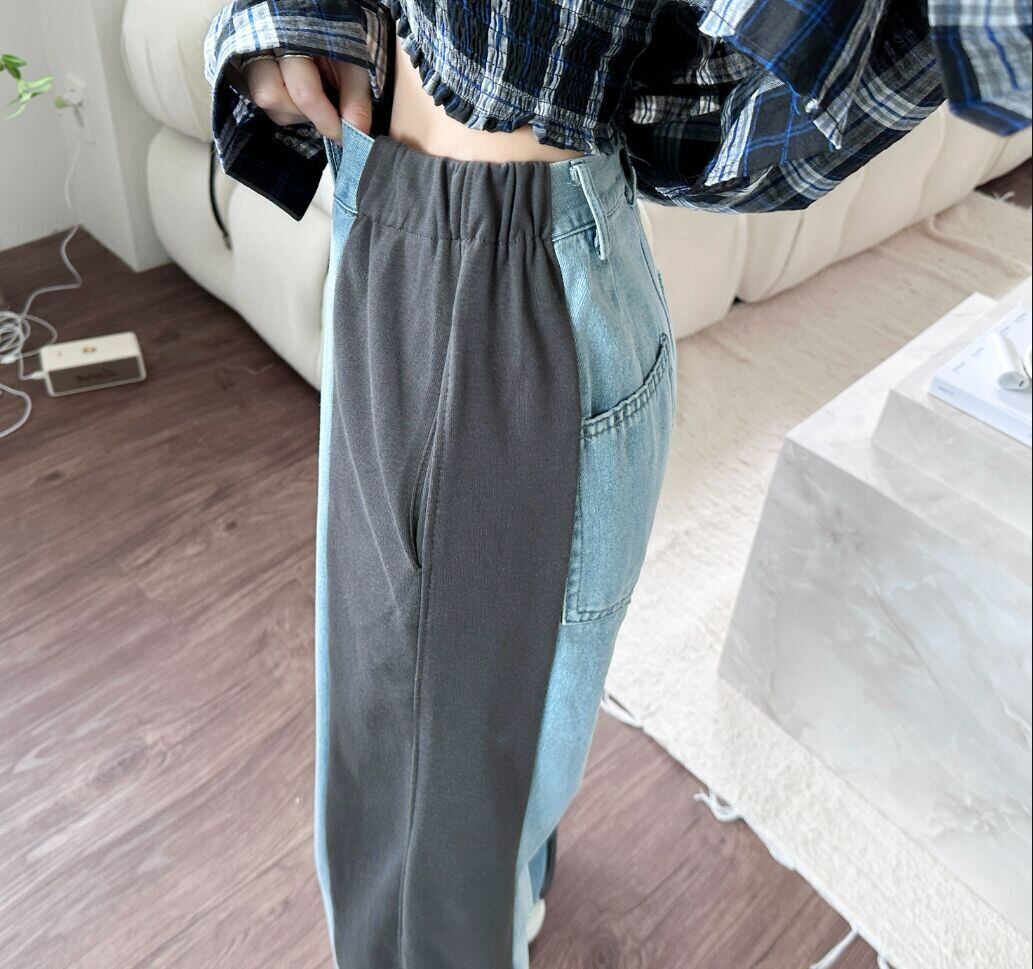 [EWQ] ワイドレッグデニムパンツウエストコントラストパッチワークストリートジーンズ秋冬服 16U5044 オータム 秋物 ウィンター 冬物 ワイドパンツ