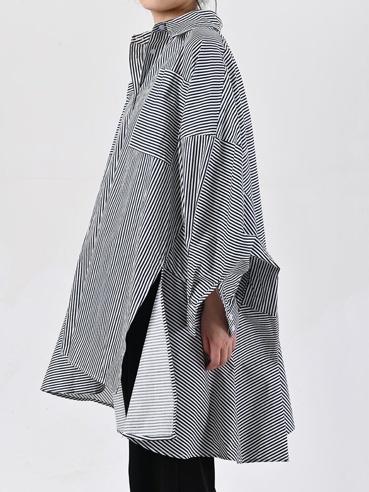 [EWQ] 不規則スプライスストライプシャツシックバットウィング長袖ビッグサイズブラウス美しいレディース服秋 P1963 ロング オータム 秋物