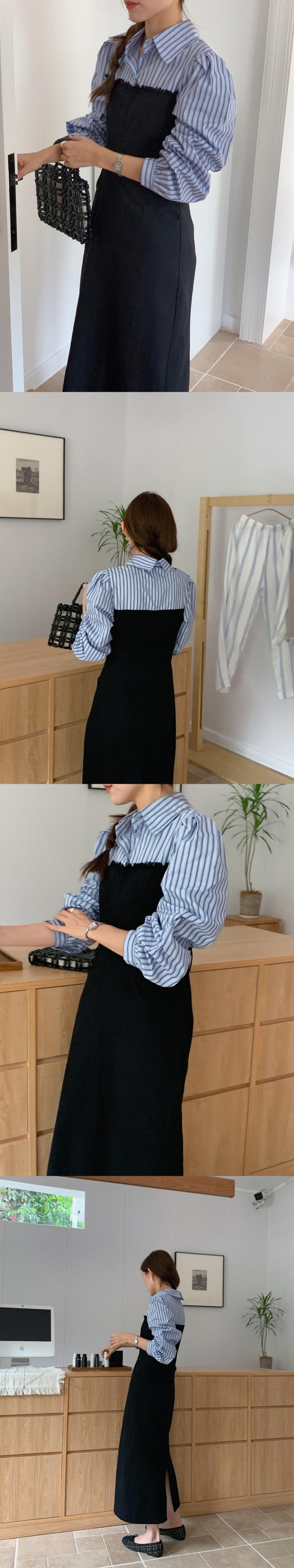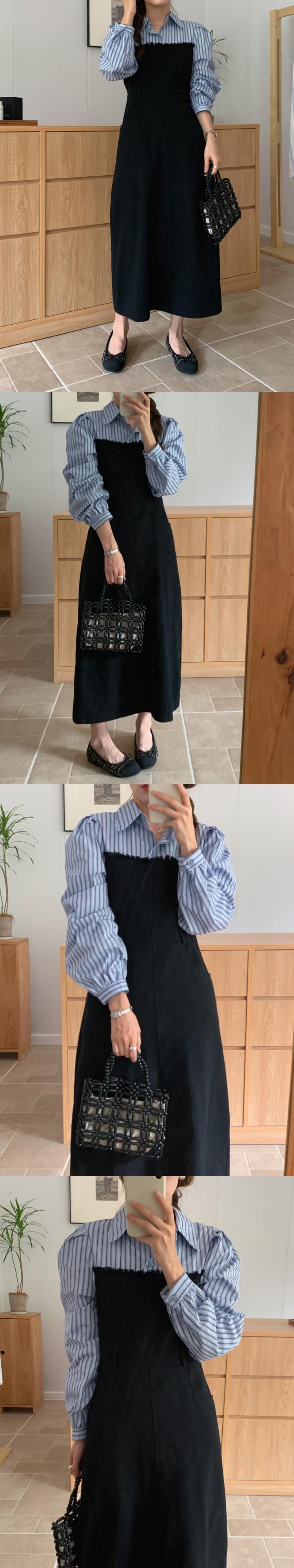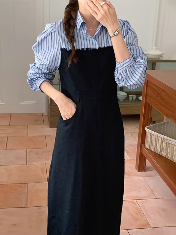 [EWQ] ストライプパッチワークフェイクツーピースドレス長袖スリムウエストドレス Vestido 秋冬 16U4679 ロング オータム 秋物 ウィンター 冬物
