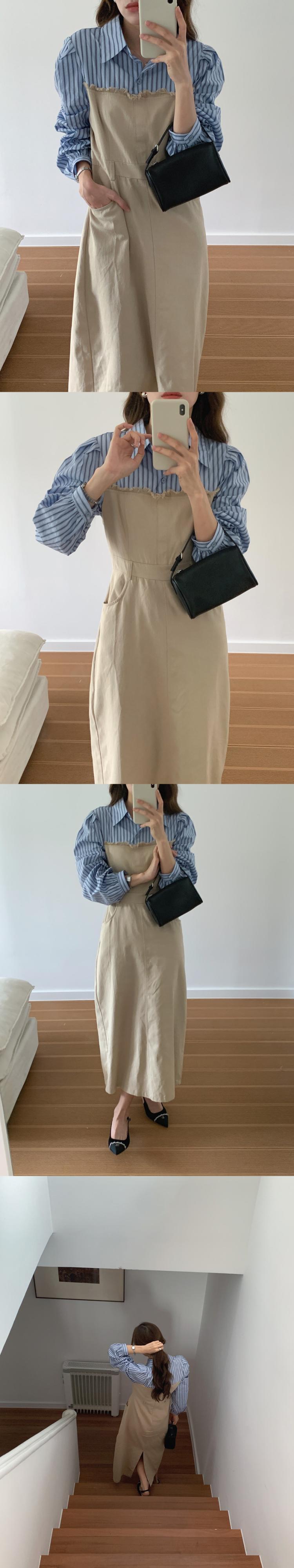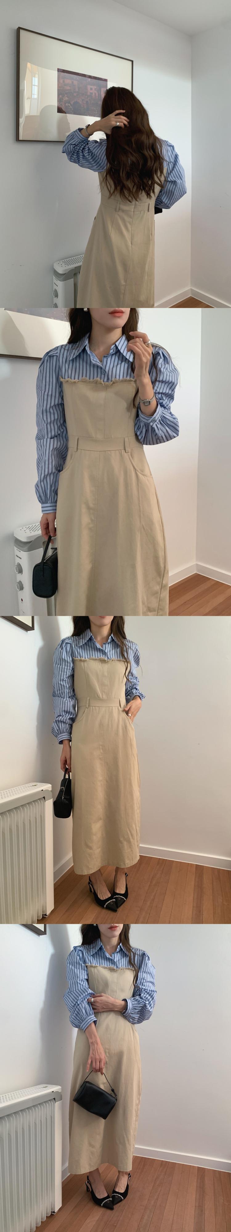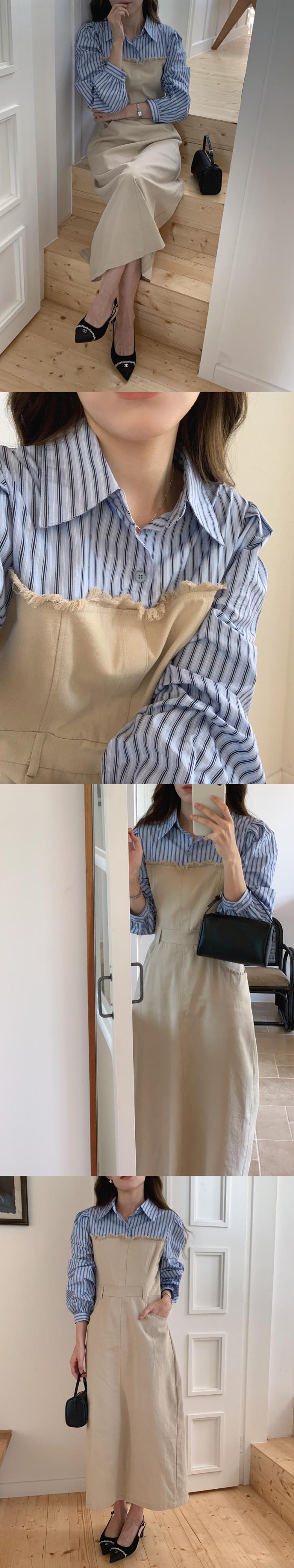 [EWQ] ストライプパッチワークフェイクツーピースドレス長袖スリムウエストドレス Vestido 秋冬 16U4679 ロング オータム 秋物 ウィンター 冬物