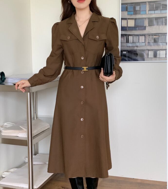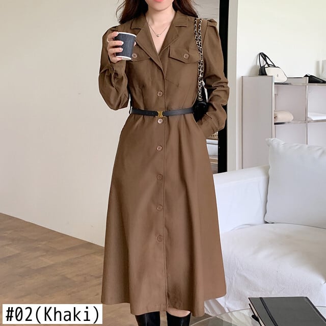 [EWQ] カーキシャツドレス長袖シングルブレストベルトドレス Vestido 秋冬 16U5033 ロング オータム 秋物 ウィンター 冬物 ハーネス