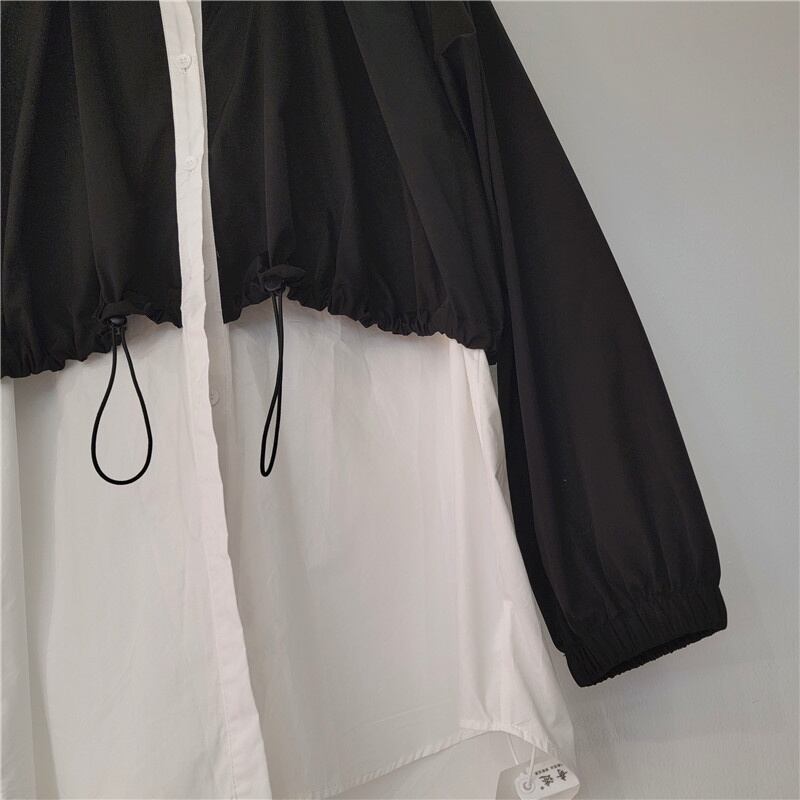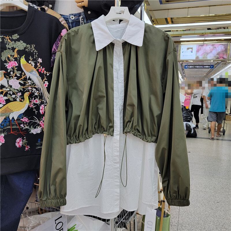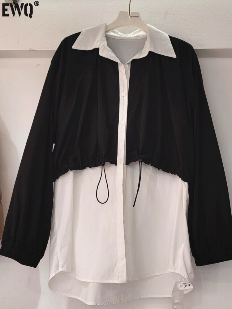 [EWQ] ルーズコントラスト パッチワーク シャツ レディース フェイク 2 ピース 巾着 長袖 秋冬 トップス 16U3985 ロング オータム 秋物 ウィンター 冬物
