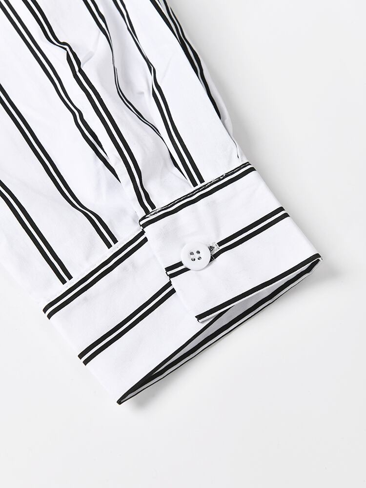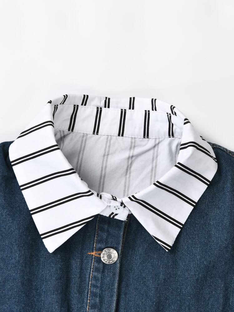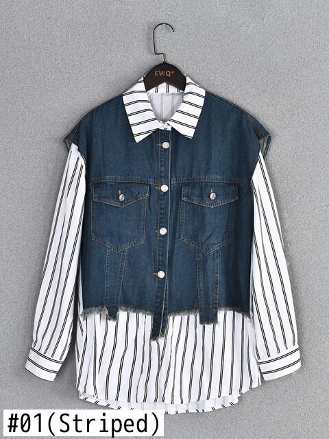 [EWQ] デニム パッチワーク シャツ レディース 長袖 シングルブレスト ストライプ 秋冬 16U4127 ロング オータム 秋物 ウィンター 冬物