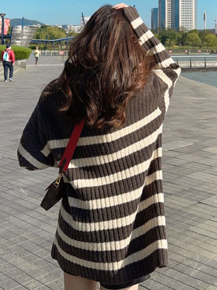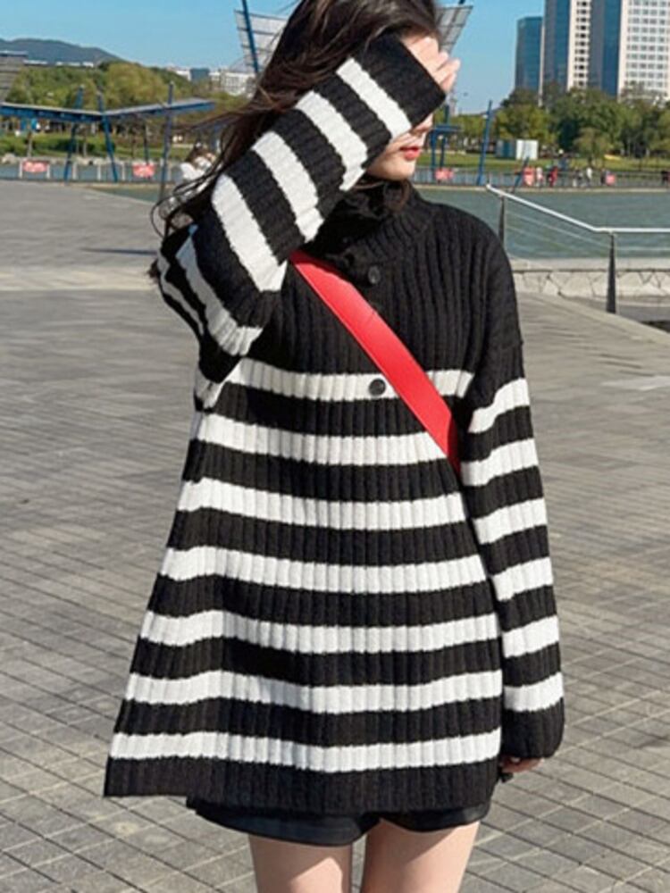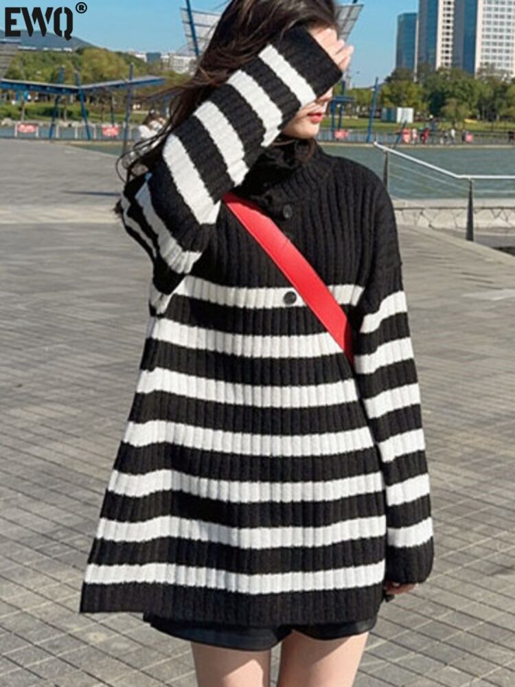 [EWQ] 黒白ストライプカラーブロッキングセータータートルネックボタンルーズプルオーバーニットトップ秋冬 16U5036 ホワイト ブラック オータム 秋物 ウィンター 冬物