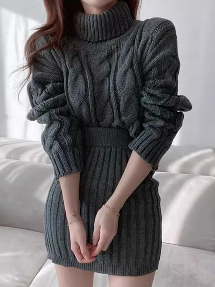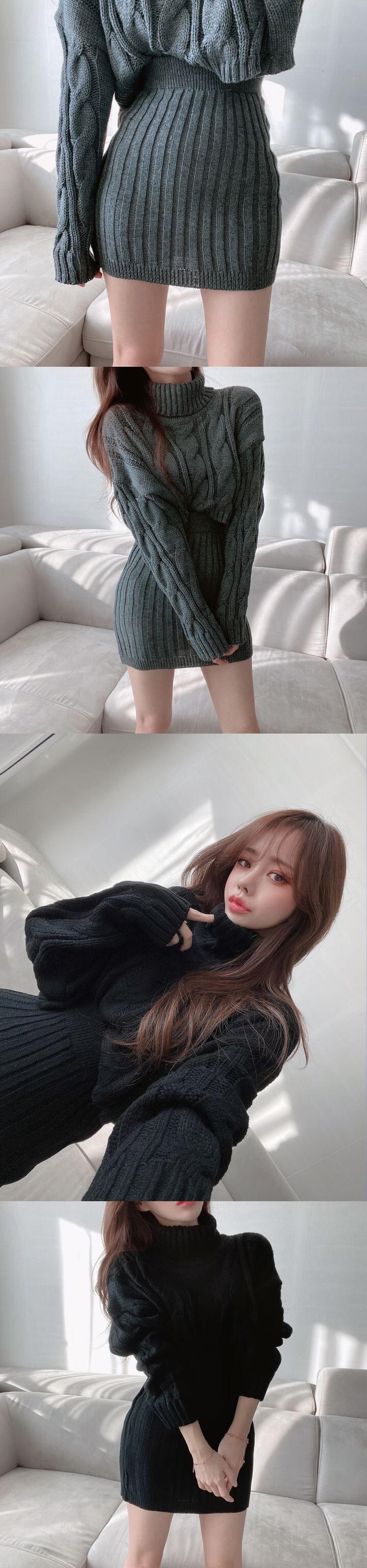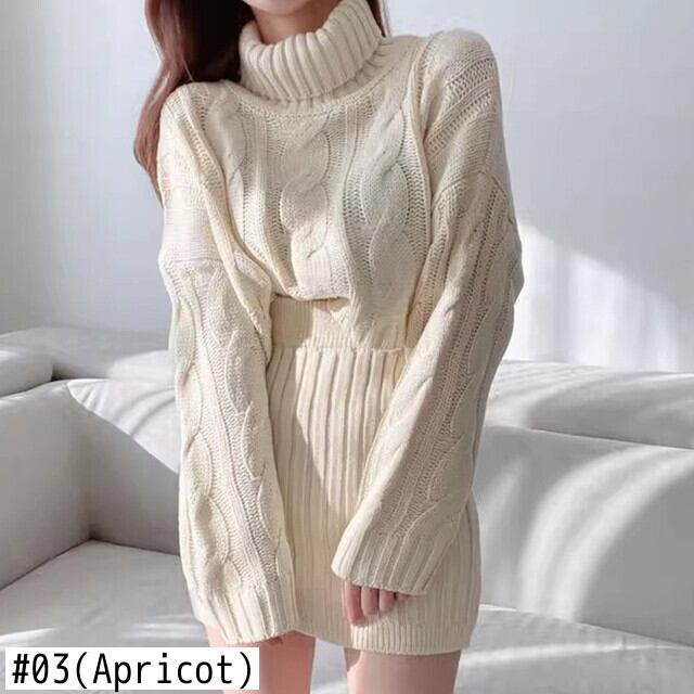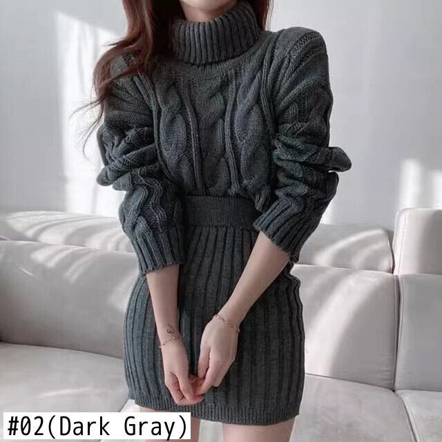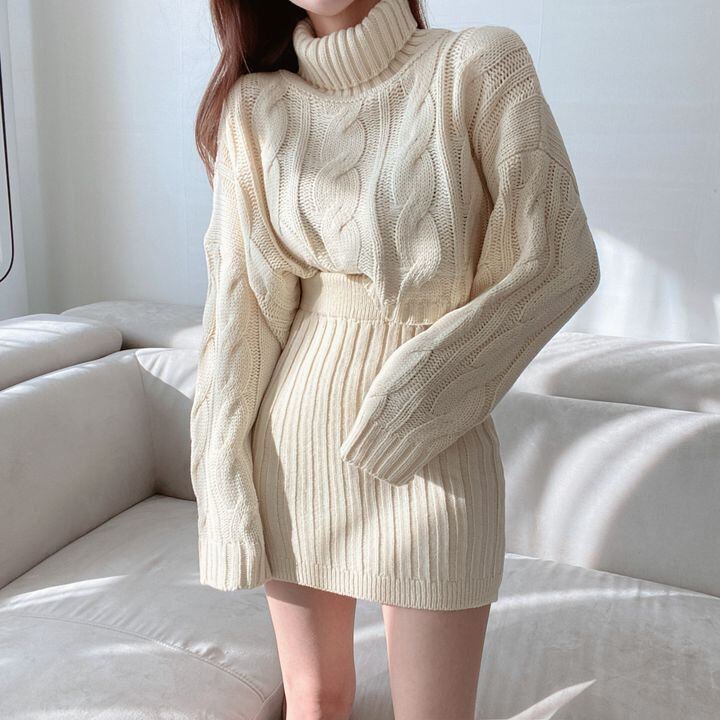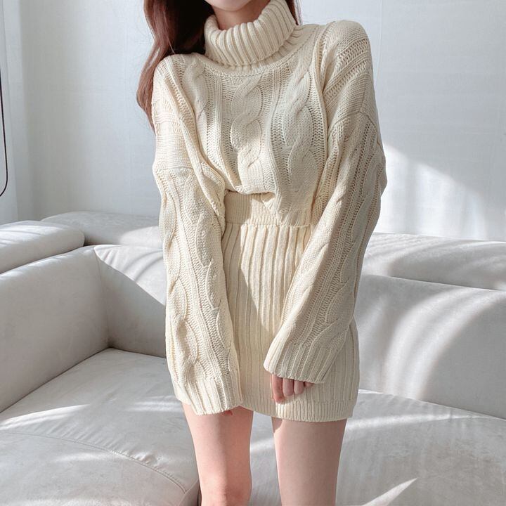 【EWQ】タートルネック長袖セーター+ウエストゴムニットミニスカート 秋冬ニット2点セット 6U4683 ロング エラスティック 伸縮 オータム 秋物 ウィンター 冬物