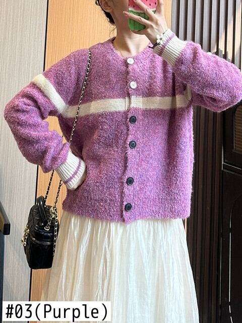 [EWQ] 甘いパープルカーディガンコートストライプコントラストルーズセータージャケット秋美しい暖かい U400 大人ガーリー スウィート キュート カジュアル オータム 秋物