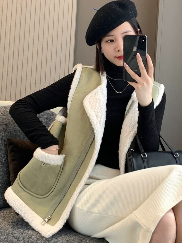 [EWQ] 厚手暖かいベストラムズウールパッチワーク M-4XL ビッグサイズ秋グリーンノースリーブジャケット秋 U4749 オータム 秋物