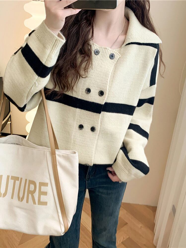 [EWQ] レトロストライプコントラストカーディガンコート長袖シングルブレストルーズセータージャケット秋冬 16U4011 ロング オータム 秋物 ウィンター 冬物