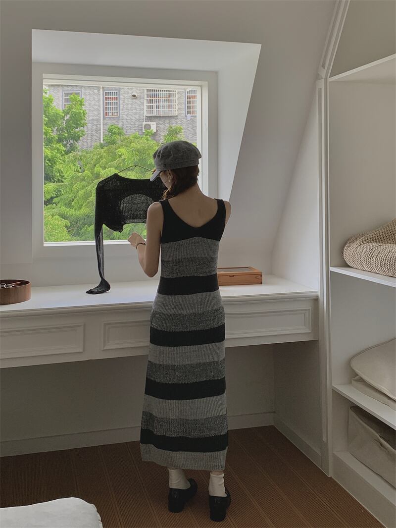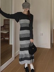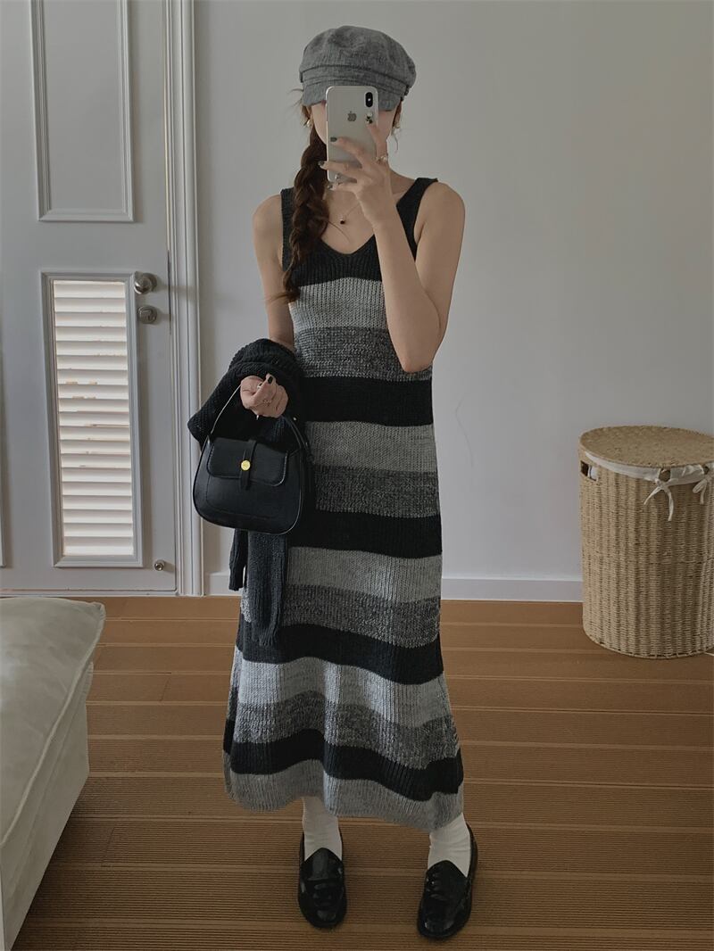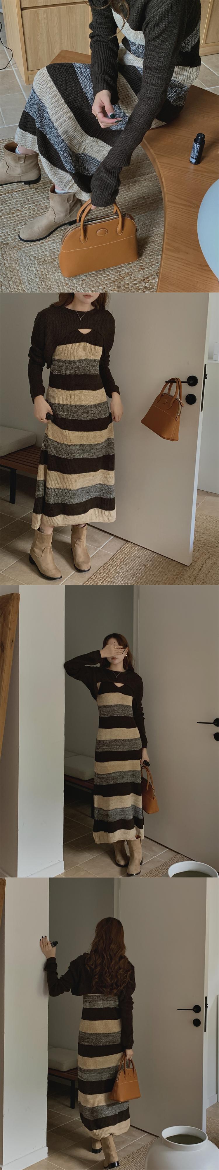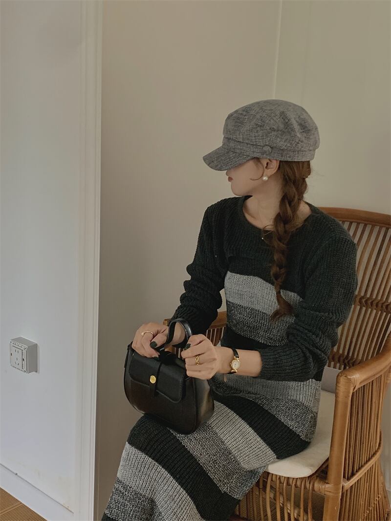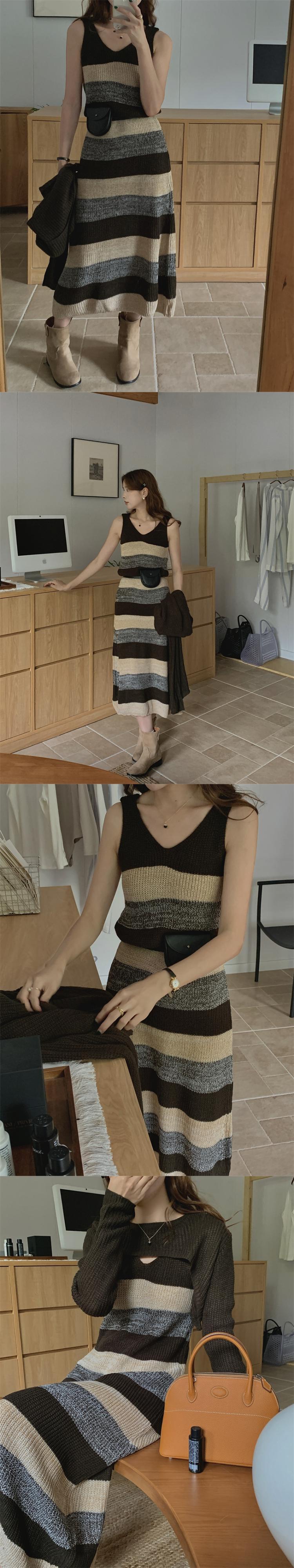 [EWQ] ニットツーピーススーツショール長袖トップ + ストライプセータータンクドレス秋冬セット 16U4610 ロング オータム 秋物 ウィンター 冬物
