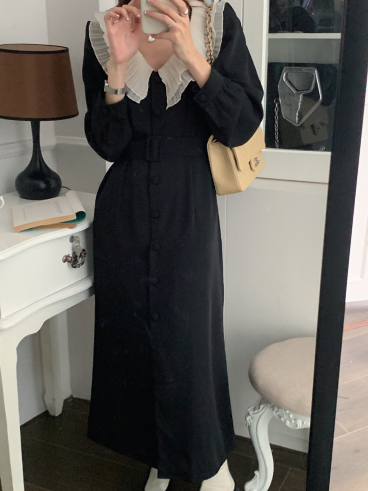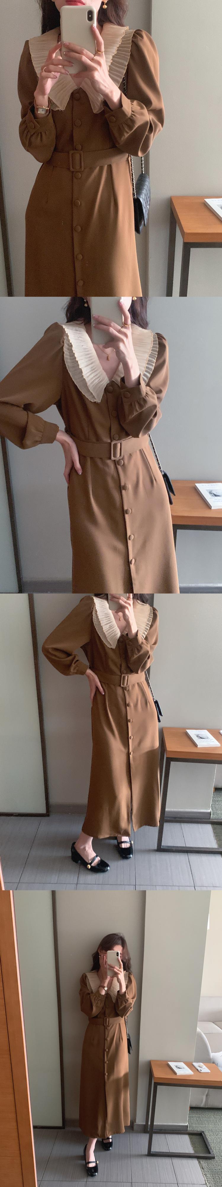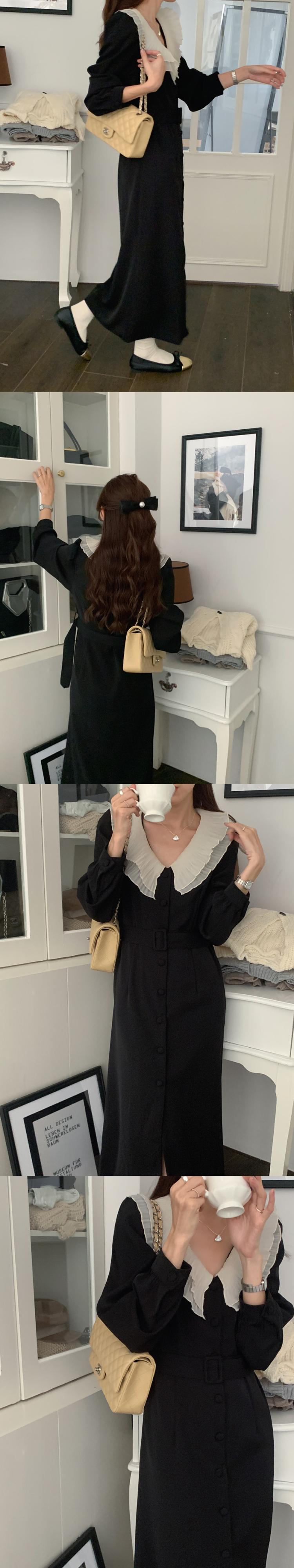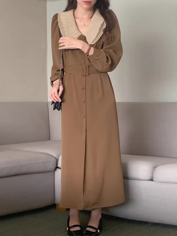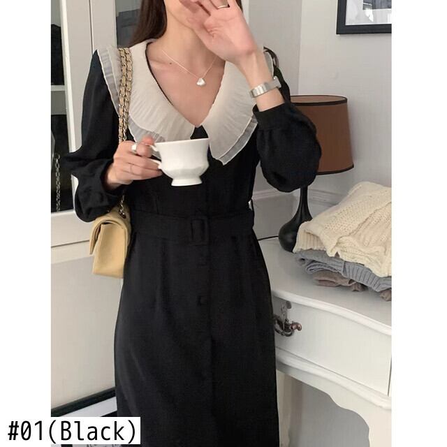 [EWQ] 大きラペルパッチワークレースアップドレスシングルブレストドレス Vestido 秋冬 16U5032 オータム 秋物 ウィンター 冬物