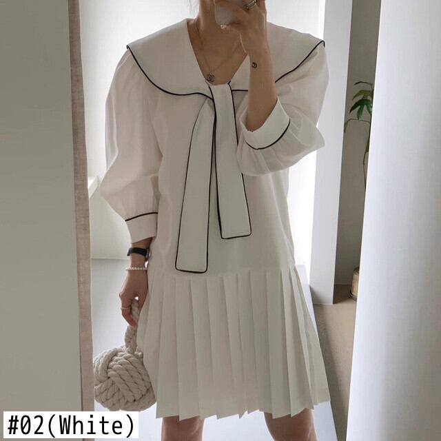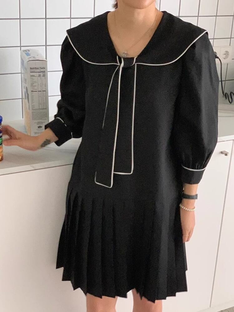 [EWQ] セーラー襟レースアップショートドレスプリーツフリルパッチワークドレス Vestido 秋冬 6U4798 オータム 秋物 ウィンター 冬物